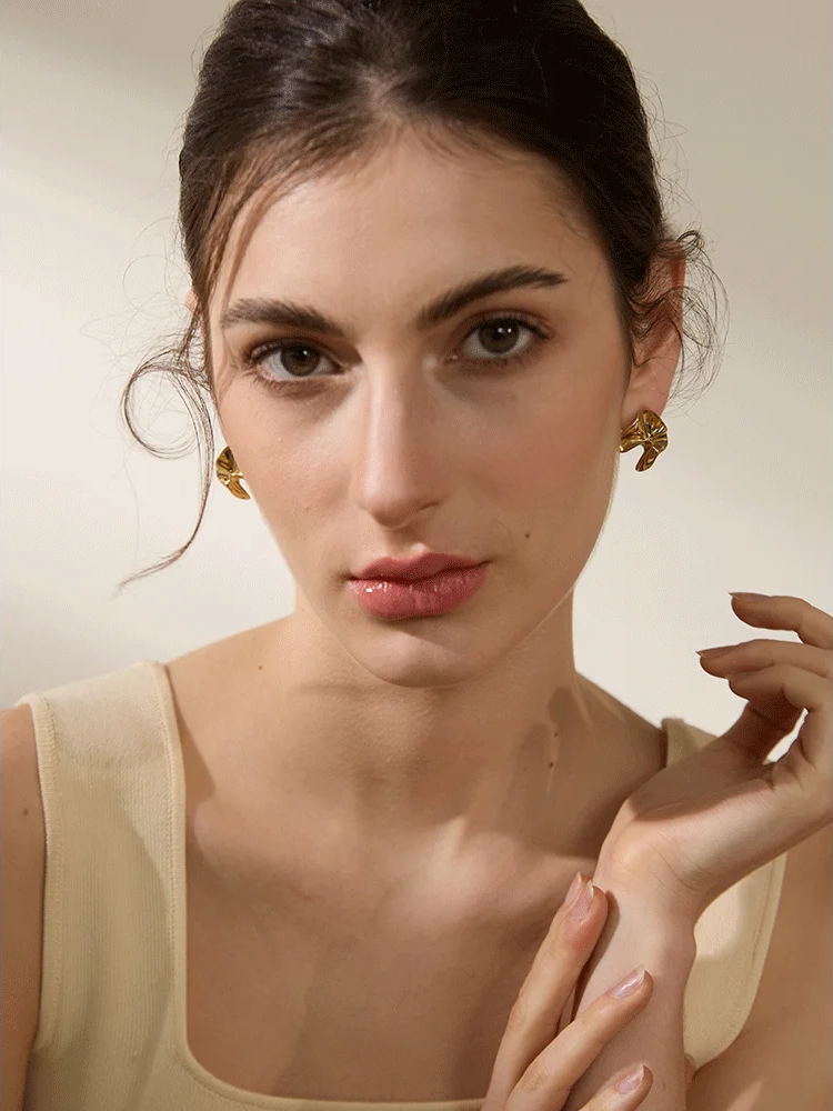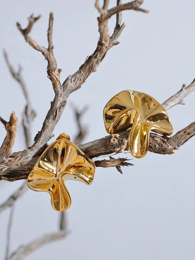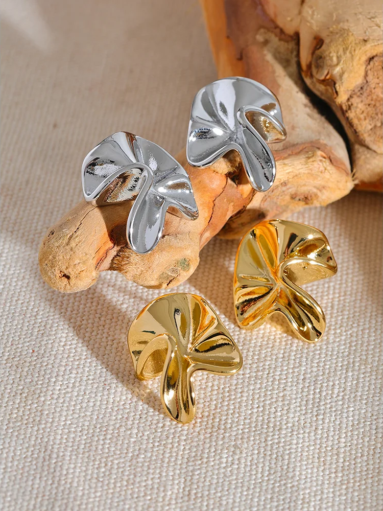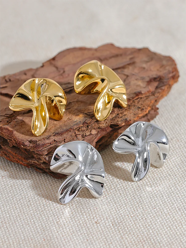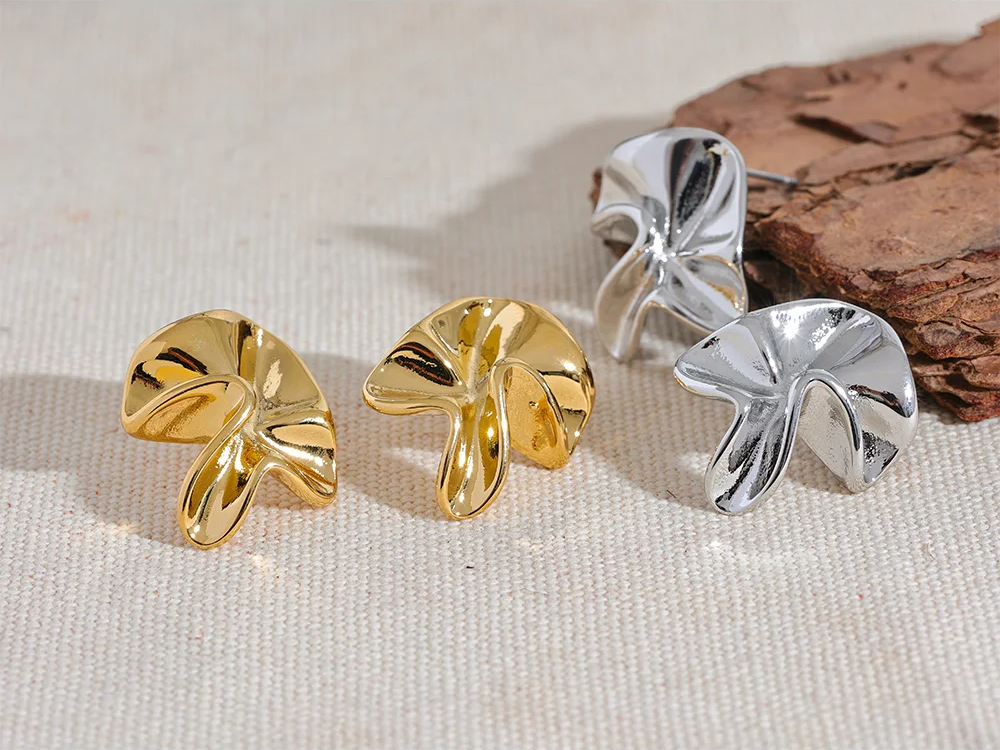 Irregular flower-shaped stud earrings crafted from durable 316L stainless steel, finished with a PVD real gold plating for a radiant shine. Designed with a modern, artistic twist, these earrings offer a unique texture and flow that adds a distinctive touch to any outfit. The push-back fastening ensures a secure and comfortable fit, while the waterproof metal construction provides lasting wear without tarnishing. Suitable for everyday fashion or special occasions, these earrings blend creativity with practicality.