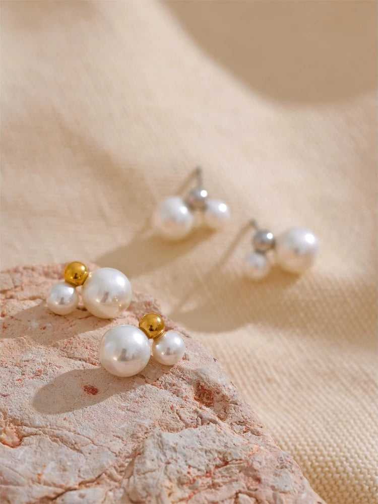 Designed with a contemporary Korean aesthetic, these round stud earrings feature imitation pearls paired with polished stainless steel accents. The lightweight studs are plated with durable PVD real gold or platinum finish for lasting shine and resistance to tarnish. Secure push-back closures ensure comfortable daily wear, making these earrings a versatile addition to any jewelry collection.