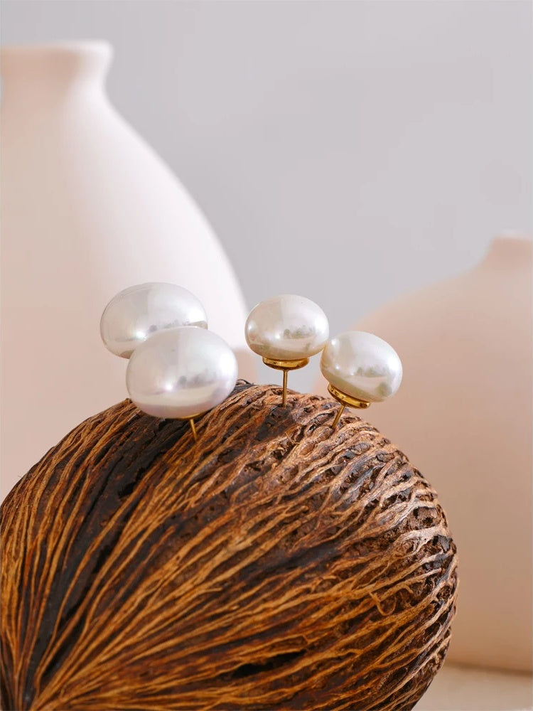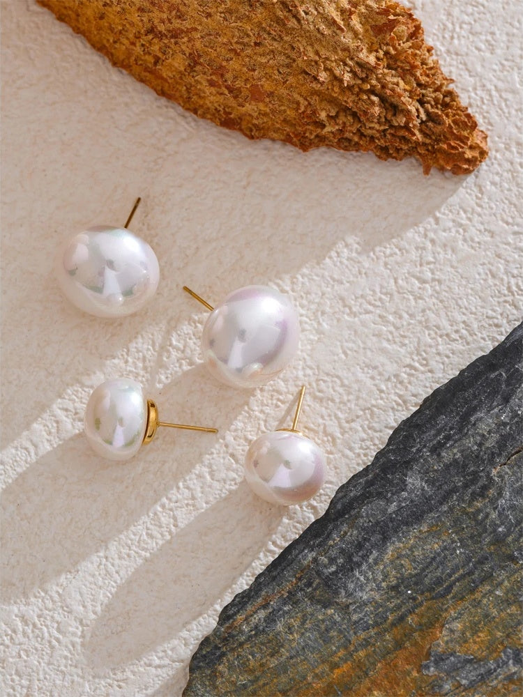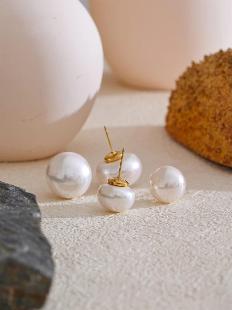 Round stud earrings featuring high-quality simulated pearls set on stainless steel posts with a PVD real gold plating finish. Available in two sizes, 18mm and 12mm, these earrings offer a polished and trendy look suitable for everyday wear. The push-back design ensures secure and comfortable fastening. Resistant to common chemicals, these fashion accessories provide lasting shine and style.