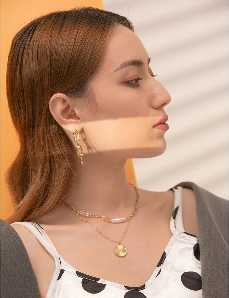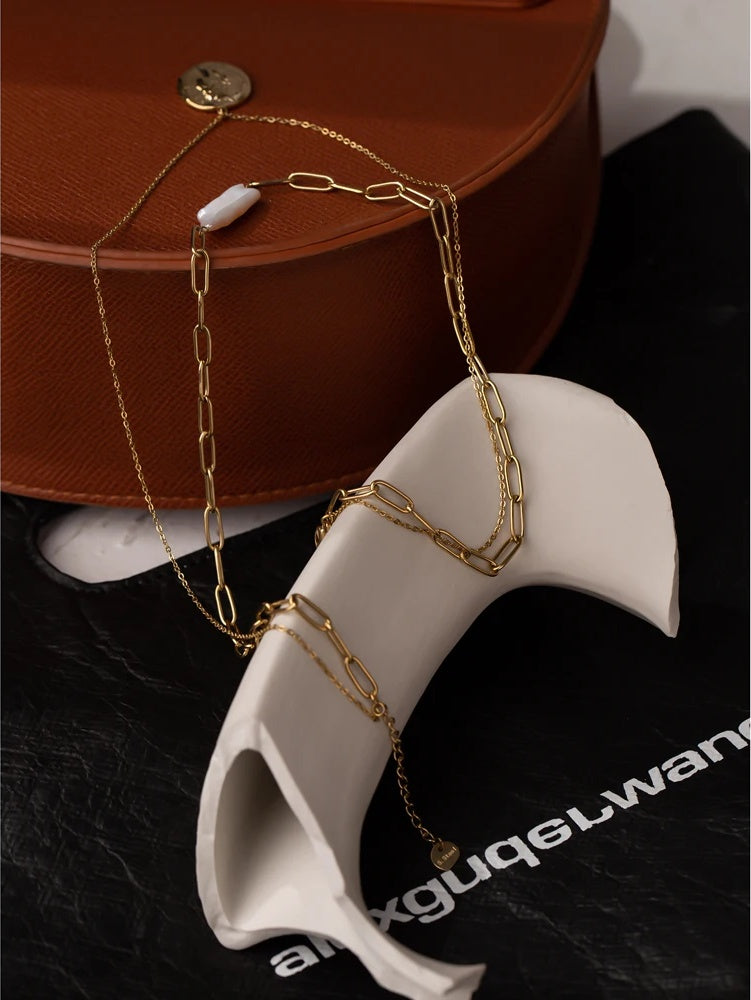 Featuring a layered design with a combination of delicate chains and a bold link chain, this necklace showcases a geometric coin pendant alongside a natural freshwater pearl. Crafted from stainless steel with a PVD real gold plating, it offers durability and a refined finish. The freshwater pearl adds a touch of organic elegance, perfect for complementing a variety of outfits. Lightweight and versatile, this necklace suits all occasions, blending trendy style with timeless elements.