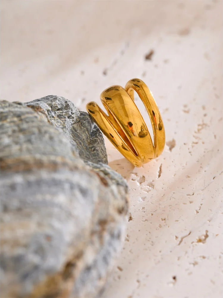 A bold geometric design defines this wide band ring, crafted from durable stainless steel with an 18K gold PVD plating for a rich, lustrous finish. Its layered construction adds depth and a modern edge, making it a versatile accessory for various styles. Resistant to rust and tarnish, this ring offers lasting wear without compromising on elegance. Adjustable sizing ensures a comfortable fit for everyday wear or special occasions.