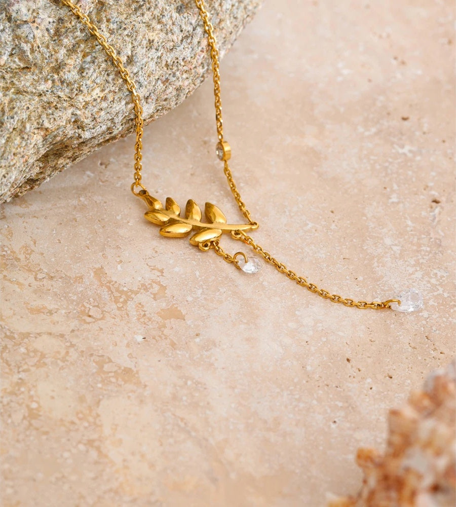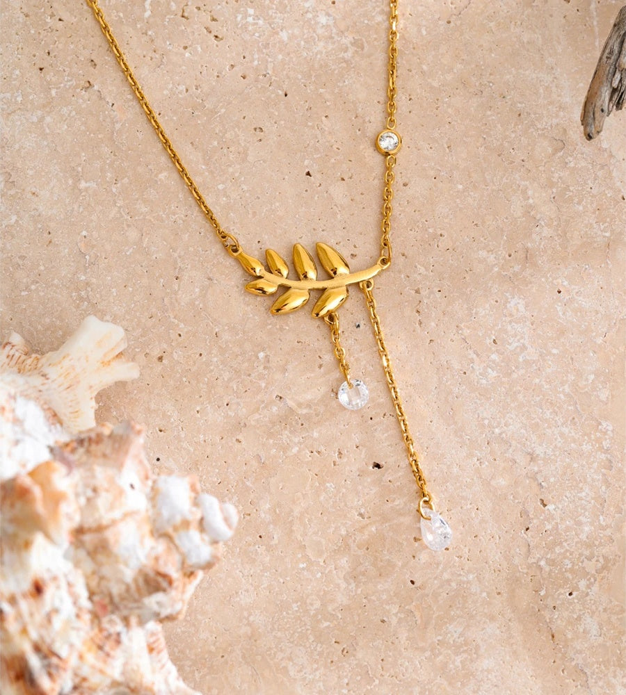 Crafted from durable stainless steel with a PVD real gold plating, this necklace features a delicate leaf-shaped pendant adorned with shimmering cubic zirconia accents. The design includes a unique tassel chain detail that adds a stylish and modern touch. Lightweight and waterproof, it offers both elegance and everyday wearability for a versatile addition to any jewelry collection.