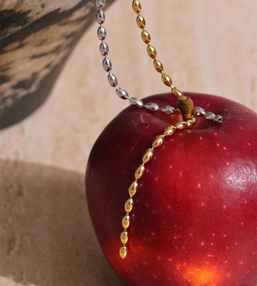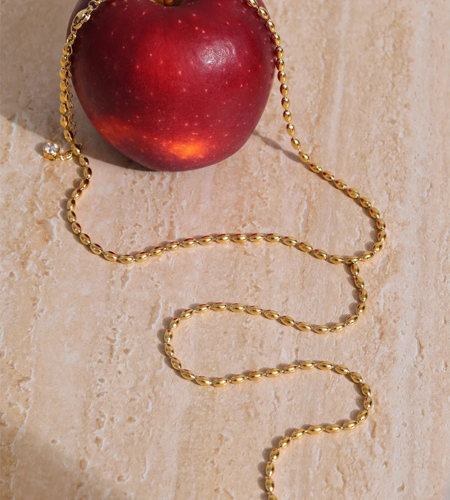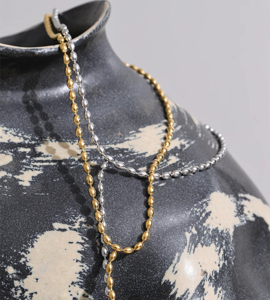 Crafted from stainless steel with a PVD real gold plating, this long chain necklace features a sleek geometric bead design for a minimalist look. The waterproof finish ensures durability, while the lightweight construction makes it comfortable for all-day wear. Perfect for layering or as a statement piece, it complements a variety of styles with its trendy and versatile appeal.