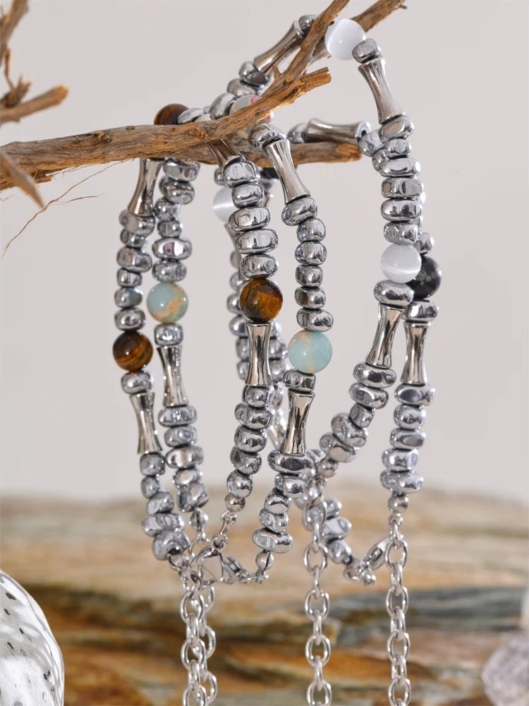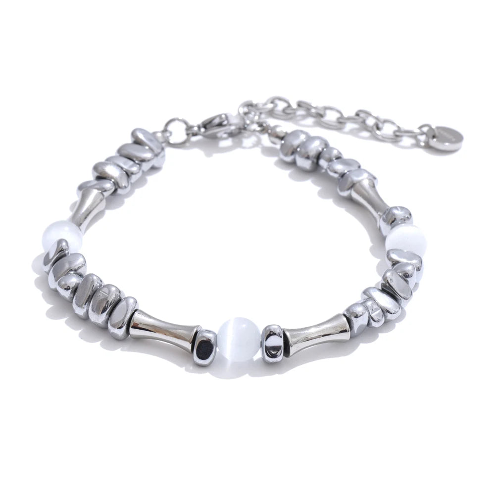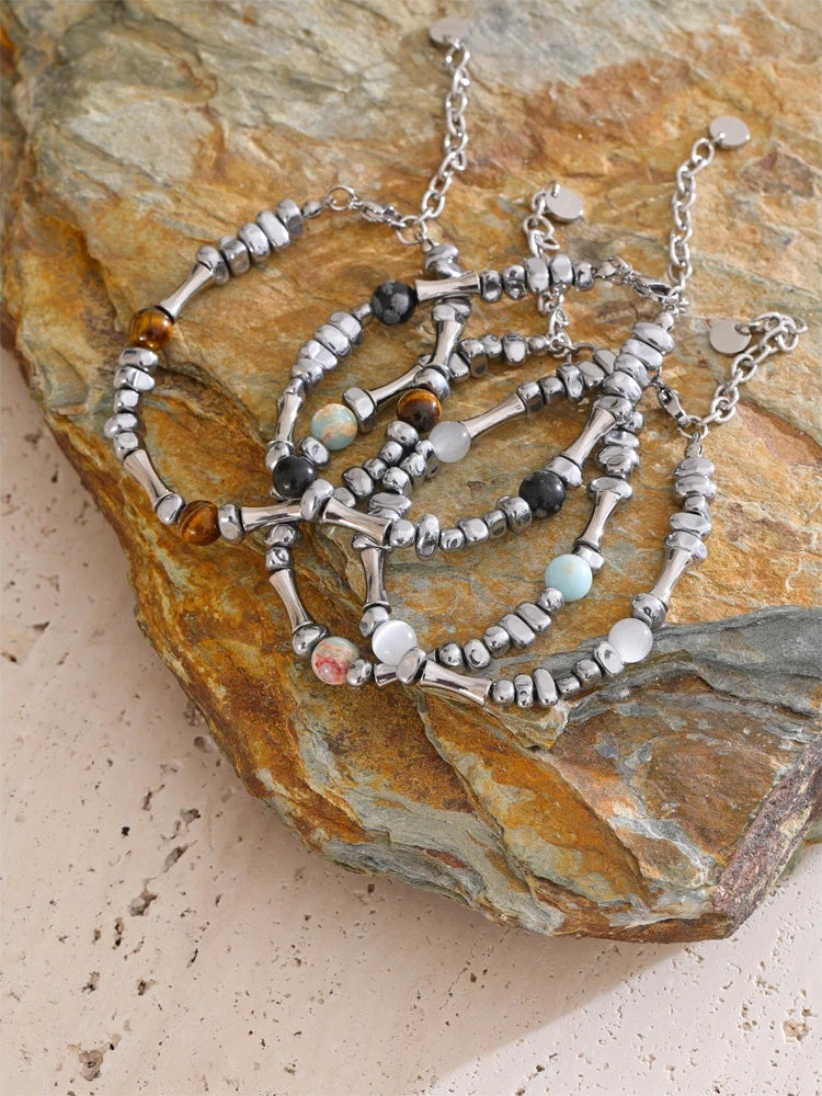 Designed for men, this bracelet features natural stone beads combined with stainless steel elements for a distinctive geometric pattern. The fashion-forward design is enhanced by a durable lobster clasp and adjustable chain, offering a secure and customizable fit. Electroplated with a PVD real gold finish, it blends contemporary style with lasting wearability. Ideal for casual or trendy looks, this charm bracelet adds a unique touch to any outfit.
