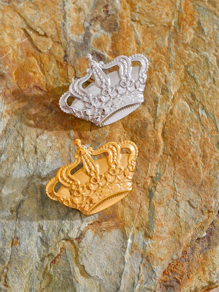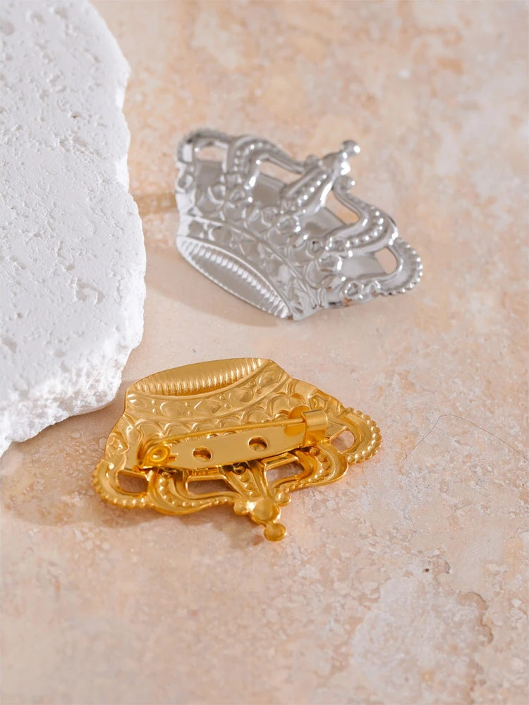 Crafted from durable stainless steel with a PVD real gold plating, this crown-shaped brooch offers a striking geometric design ideal for both men and women. Its rust-proof finish ensures long-lasting wear, while the lightweight metal construction adds comfort without sacrificing style. Suitable for a variety of outfits, this unisex accessory blends trendy appeal with reliable quality. Available in gold and steel color options to complement different tastes.
