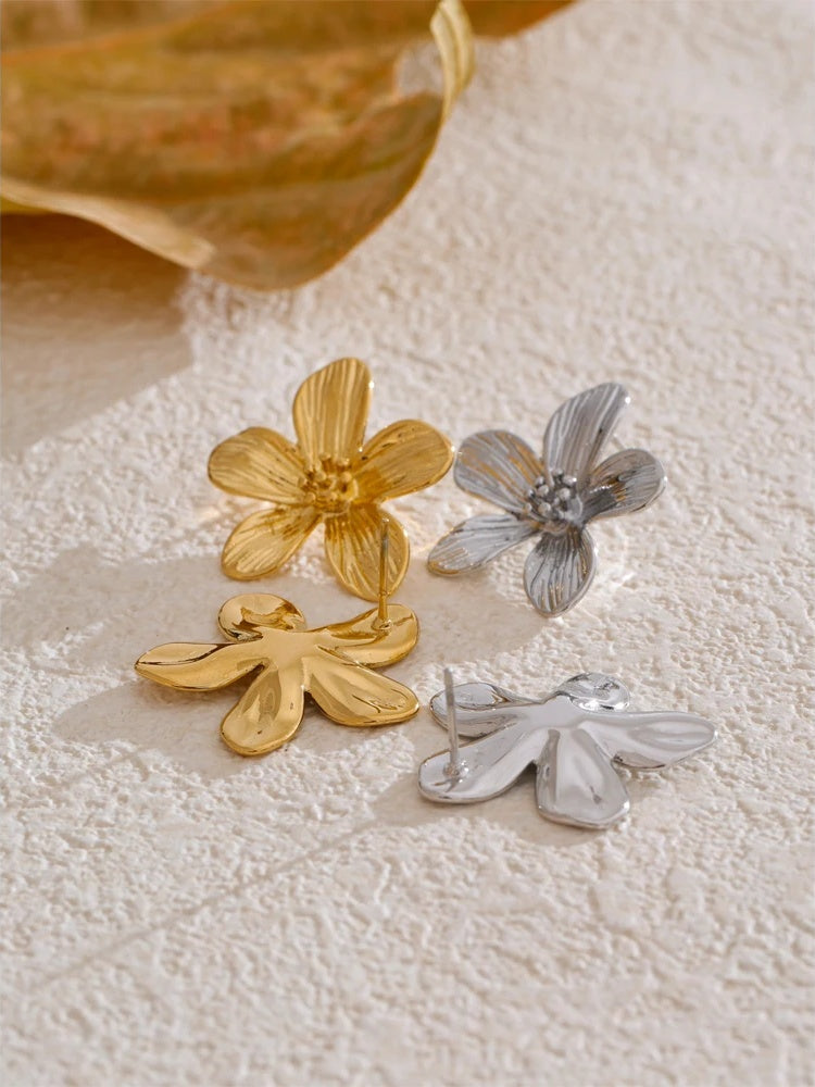 Crafted from durable stainless steel with a high-quality PVD real gold plating, these floral stud earrings offer a stylish yet hypoallergenic accessory option. The textured flower design adds subtle dimension and charm, making them suitable for everyday wear. Featuring a secure push-back fastening, they provide both comfort and ease of use. Available in versatile metal tones to complement a variety of looks.