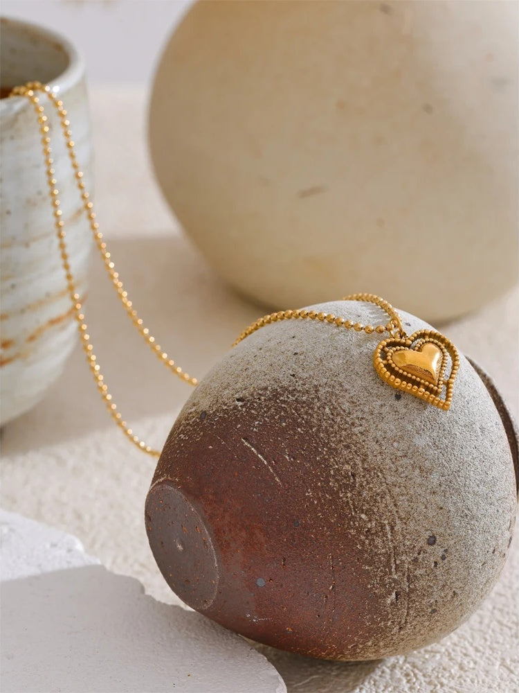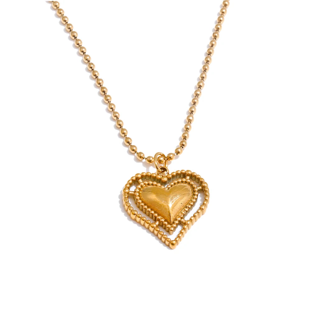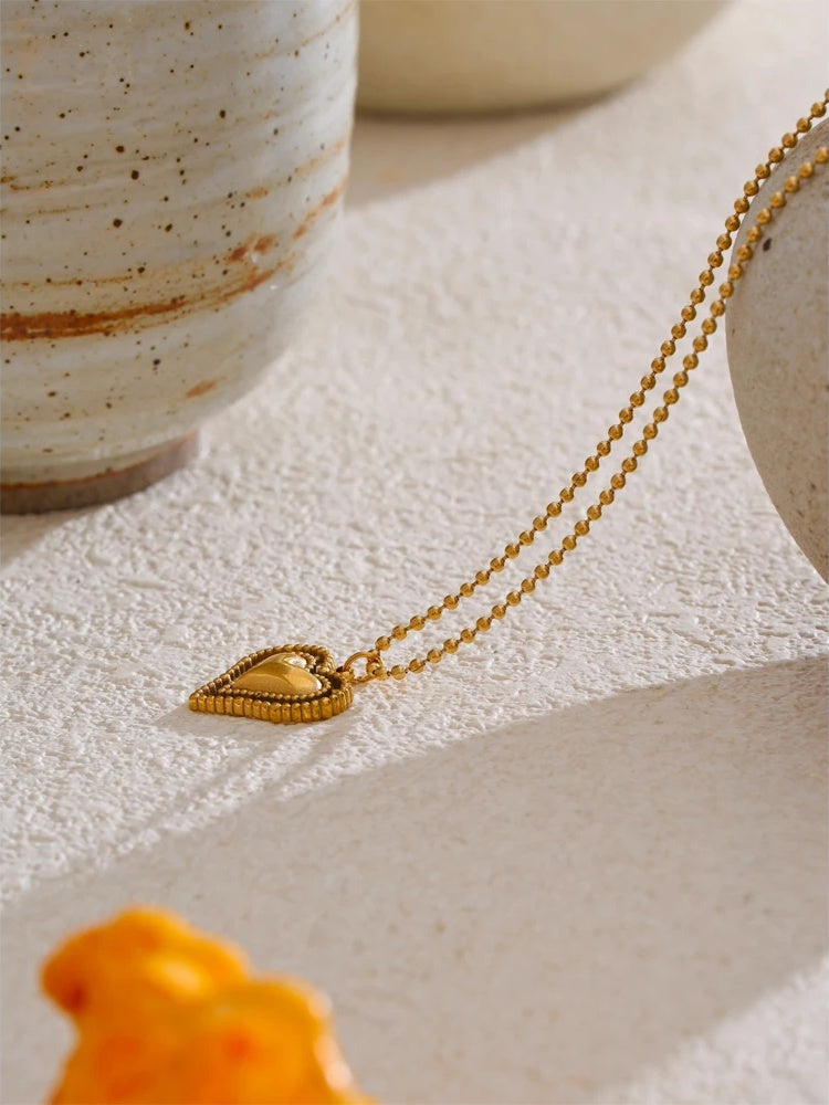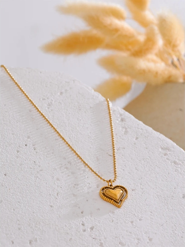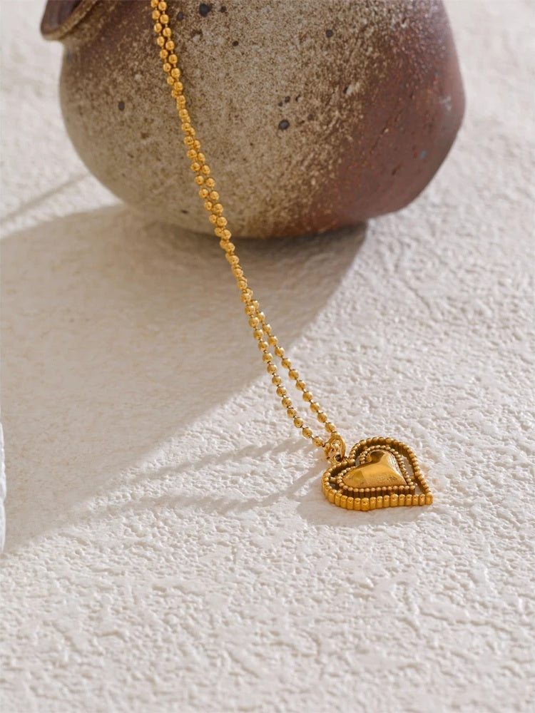 Elevate everyday style with a heart pendant that feels both modern and romantic. Expertly crafted in stainless steel and finished with PVD real gold plating, this necklace delivers a long-lasting luster and a refined glow. A layered heart silhouette and intricate beaded edges add depth and texture, creating a subtle statement that complements everything from casual tees to evening dresses.