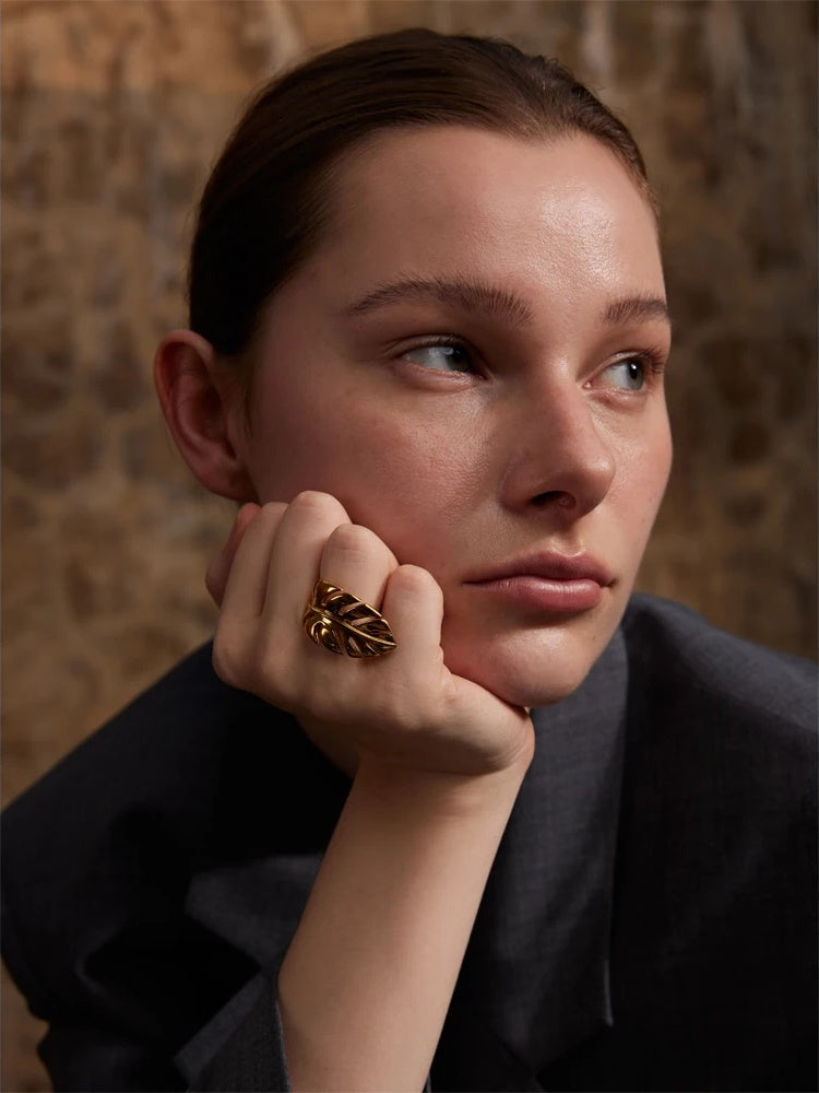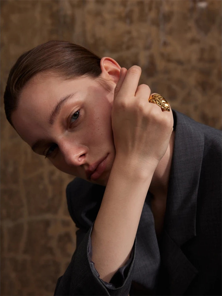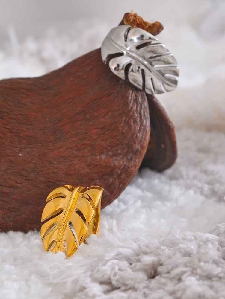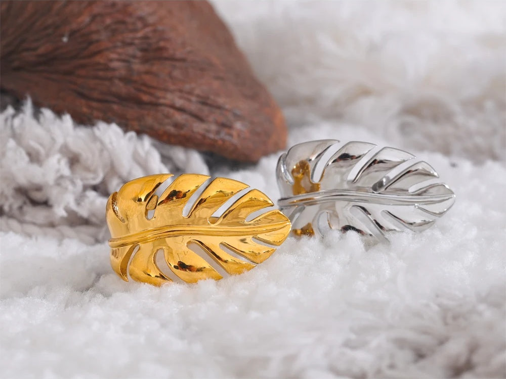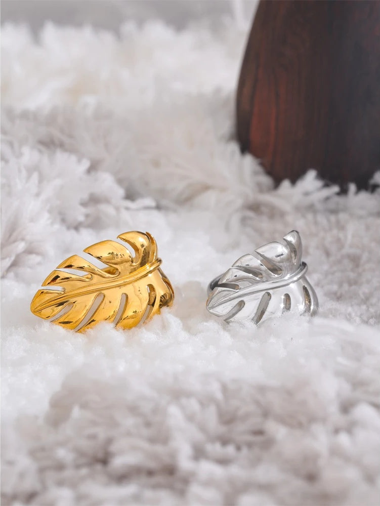 Crafted from durable stainless steel with an 18k gold PVD plating, this open ring features a stylish leaf design that adds a unique geometric flair. Its rust-proof and water-resistant properties ensure long-lasting wear, making it perfect for everyday use or special occasions. Designed to fit comfortably on sizes 6.5 to 8.5, it combines fashion-forward aesthetics with practical durability.