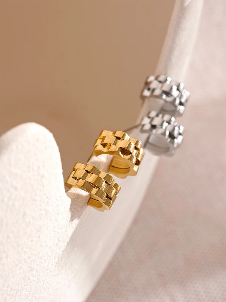 Crafted from stainless steel with 18K gold plating, these hoop earrings showcase a distinctive geometric texture that adds a modern edge to any outfit. The minimalist design combines both smooth and textured surfaces for a sophisticated yet trendy look. Lightweight and durable, they offer everyday comfort without compromising style. Perfect for those seeking a timeless accessory with a contemporary twist.