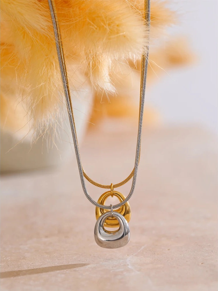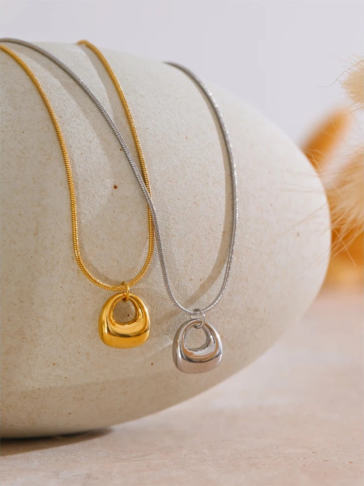Crafted from stainless steel with a durable gold PVD plating, this pendant necklace features a smooth, abstract small bag shape that offers a modern geometric appeal. Its minimalist design complements a variety of outfits, making it a versatile accessory for everyday wear. Lightweight and comfortable, the necklace is suitable for all occasions and adds a subtle yet distinct touch to any look.