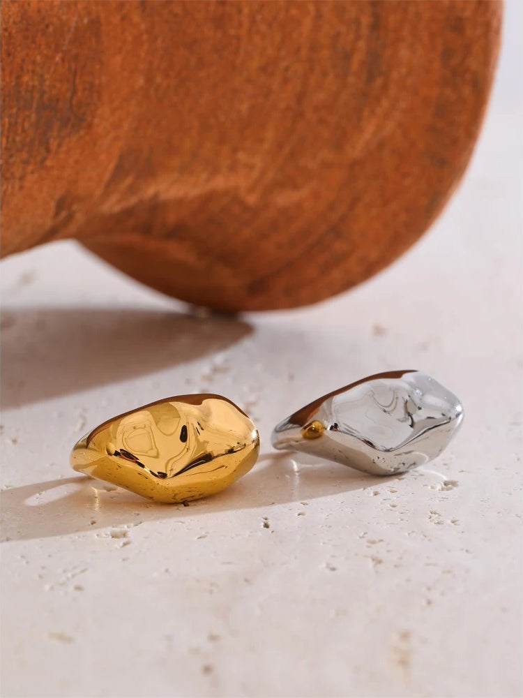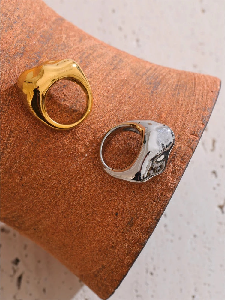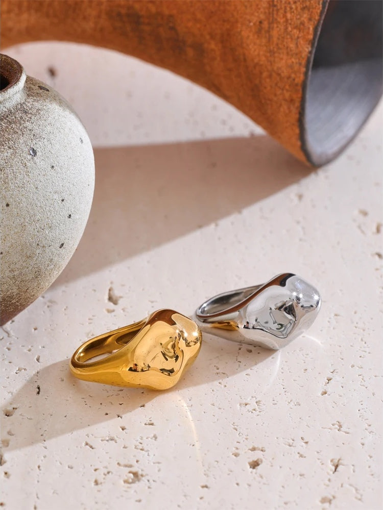 Crafted from durable stainless steel with an 18k gold PVD plating, this geometric ring features a bold, sculptural design that stands out with a high-quality textured finish. Its minimalist yet striking silhouette makes it a versatile accessory suited for various occasions, particularly parties. Available in multiple sizes and finishes, it offers compatibility and comfort for everyday wear while maintaining a trendy aesthetic.