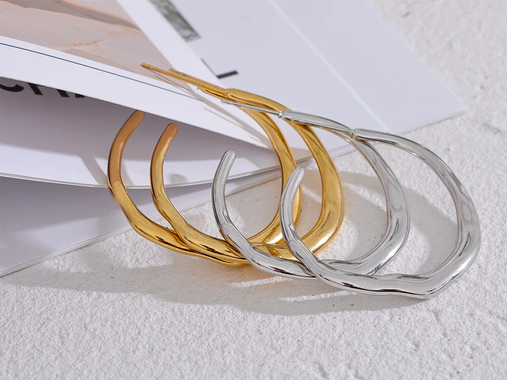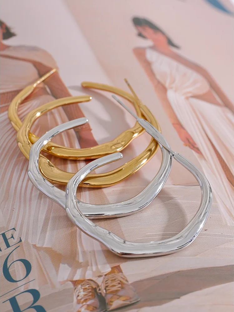 These hoop earrings feature a contemporary geometric design crafted from high-quality stainless steel with an 18K gold plating for a polished finish. The minimalist shape offers a chic and versatile look, perfect for daily wear. Designed to be waterproof, they maintain their shine and durability over time. Lightweight and comfortable, they make an excellent gift choice for anyone who appreciates simple, stylish jewelry.