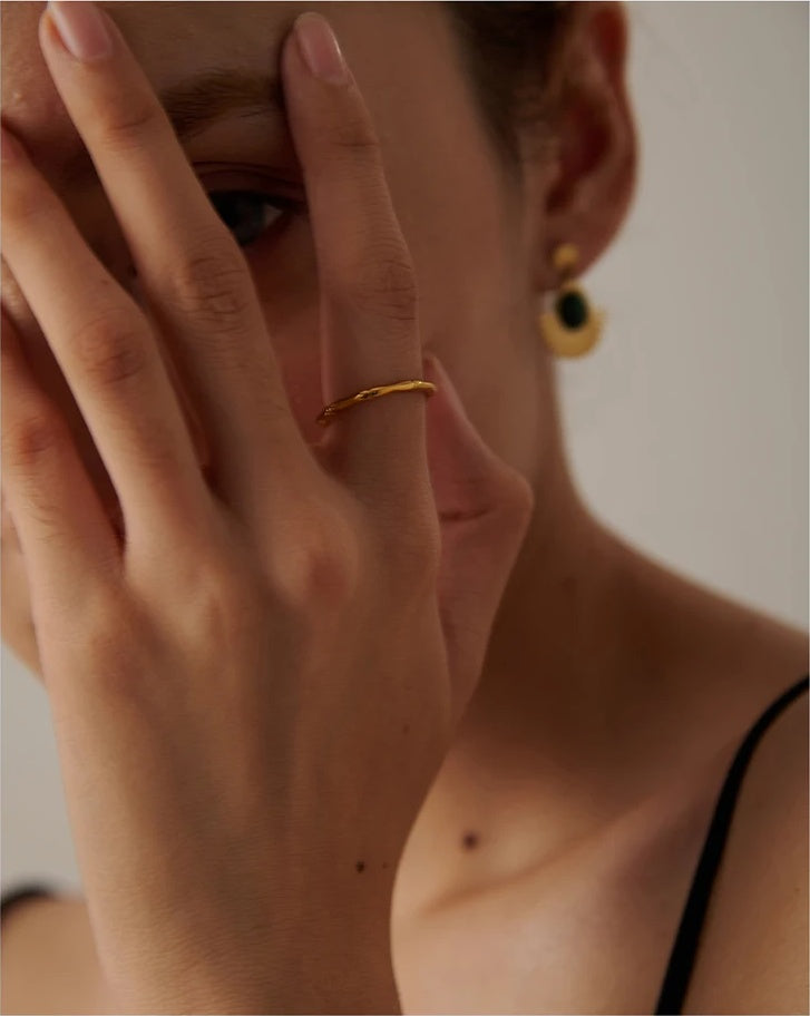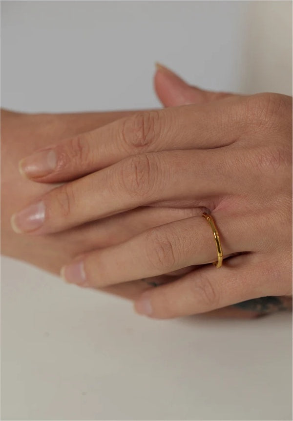 Elevate your everyday edit with this minimalist bamboo ring—crafted from durable stainless steel and finished with real gold plating for a warm, refined glow. The rounded, comfort-fit band and subtle bamboo joint detailing create a distinctive yet understated look that suits both office hours and evening plans.