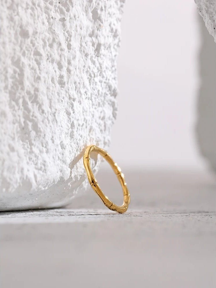 Wear it solo for a clean, minimalist statement, or stack it with other gold-plated rings for a layered look. Its versatile bamboo-inspired design pairs beautifully with everyday jewelry and special-occasion pieces alike.
