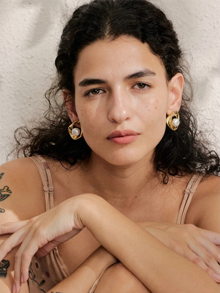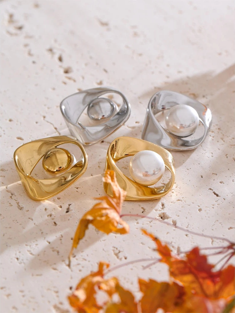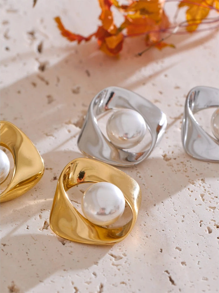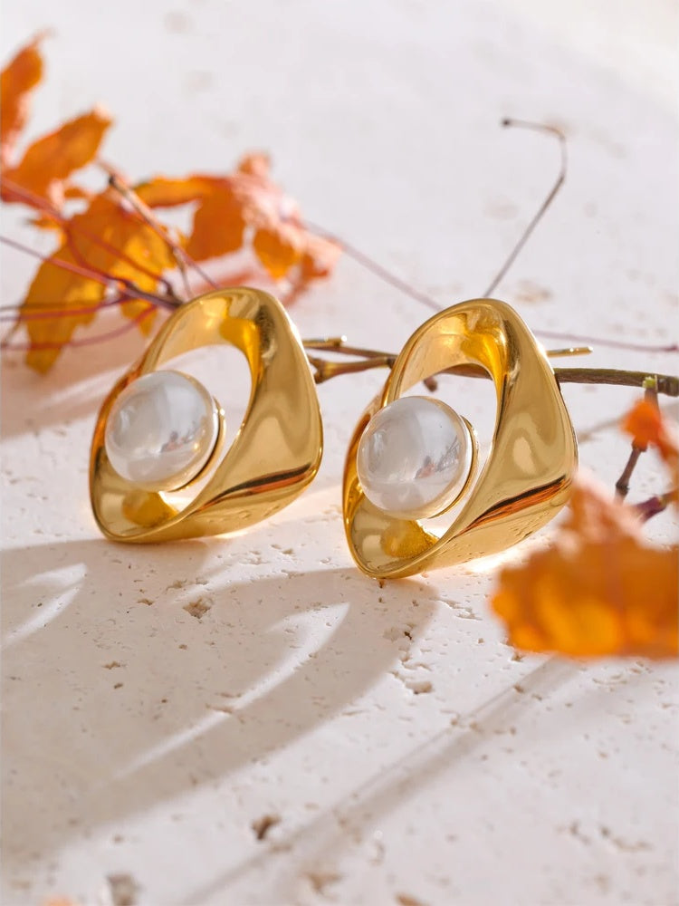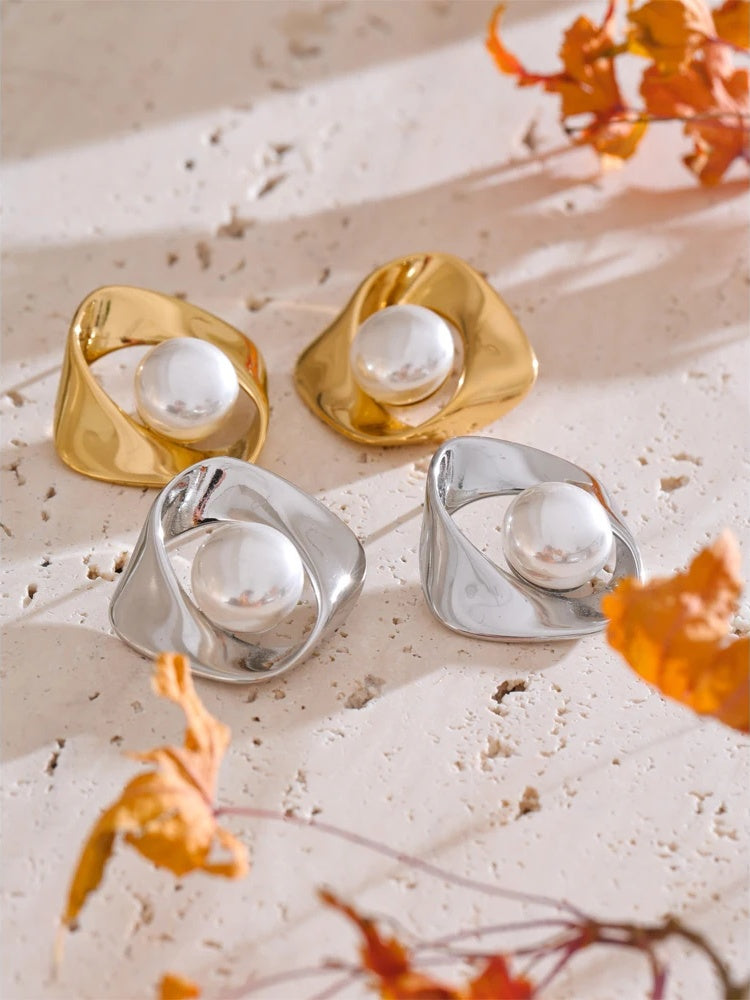 Modern geometry meets timeless luster in these pearl-accented studs from Hoops & Gems. Meticulously crafted in stainless steel and finished with durable PVD real-gold plating or a sleek platinum tone, each earring features a softly irregular silhouette that frames a luminous simulated pearl—minimalist, refined, and effortless for every day.