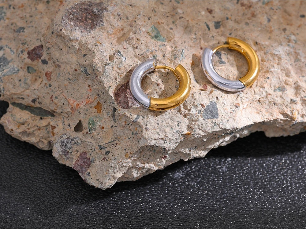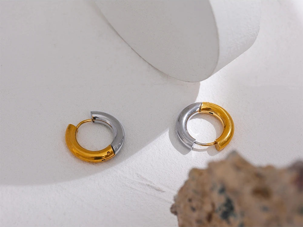 Crafted from durable stainless steel with a real gold PVD plating, these hoop earrings feature a distinctive two-tone design in gold and silver. Their minimalist round shape offers a modern and versatile look suitable for various styles and occasions. Lightweight and comfortable, they are designed to complement both casual and formal outfits with subtle elegance.