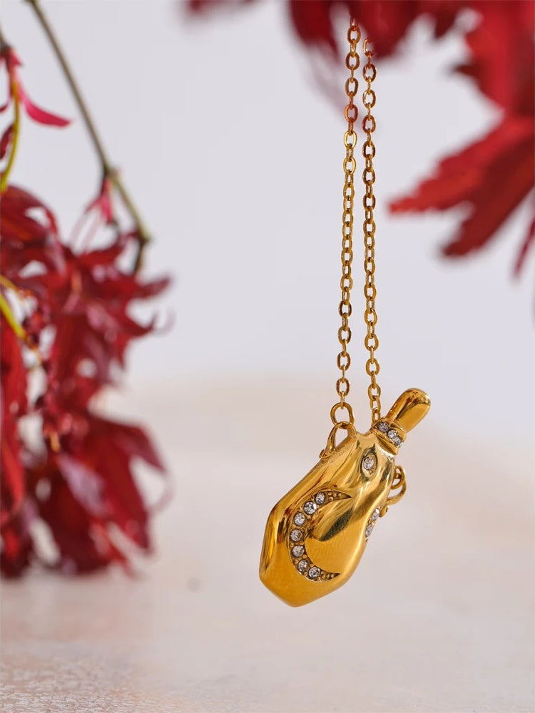 Elevate your everyday look with a modern pendant that balances clean geometry and soft sparkle. Crafted from stainless steel and finished with durable 18K gold PVD plating, this necklace features a distinctive wishing kettle silhouette accented by a crescent moon set with shimmering cubic zirconia. Its polished surface catches the light without overpowering, making it an easy, elegant choice for work, weekends, and everything in between.