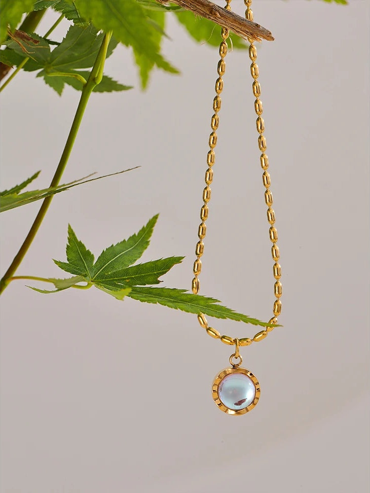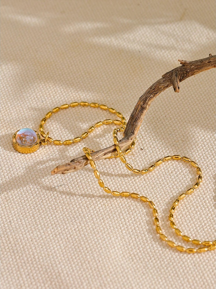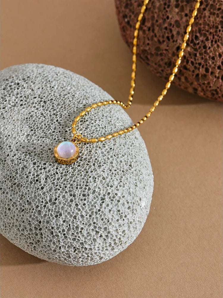 A chic pendant necklace featuring a natural moonlight stone set in a geometric stainless steel frame with a PVD real gold plating finish. The chain is composed of smooth, polished metal beads that complement the pendant’s sleek design. Durable and waterproof, this high-quality piece suits various styles and occasions. Available in both gold and steel tones to fit personal preferences.