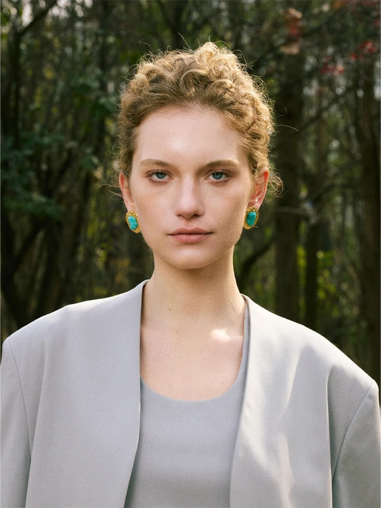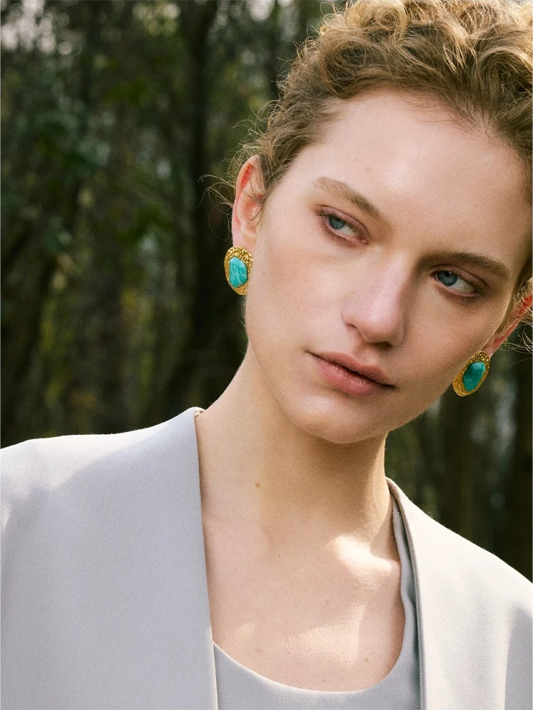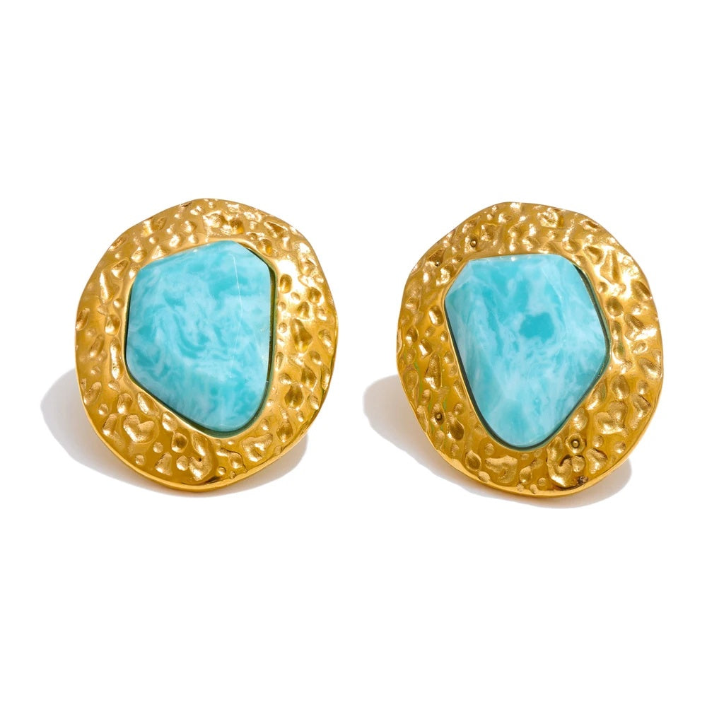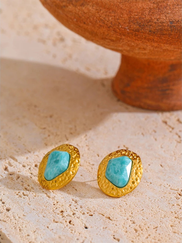 Natural amazonite stones are set within hammered gold-tone stainless steel, creating a striking contrast of textures and colors. These stud earrings feature an 18k PVD plating that ensures long-lasting durability and resistance to water. Designed with a push-back closure, they offer secure and comfortable wear for daily use. Their geometric shape adds a trendy, modern edge to any outfit.