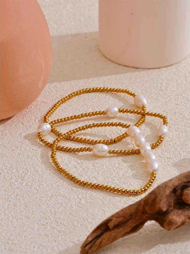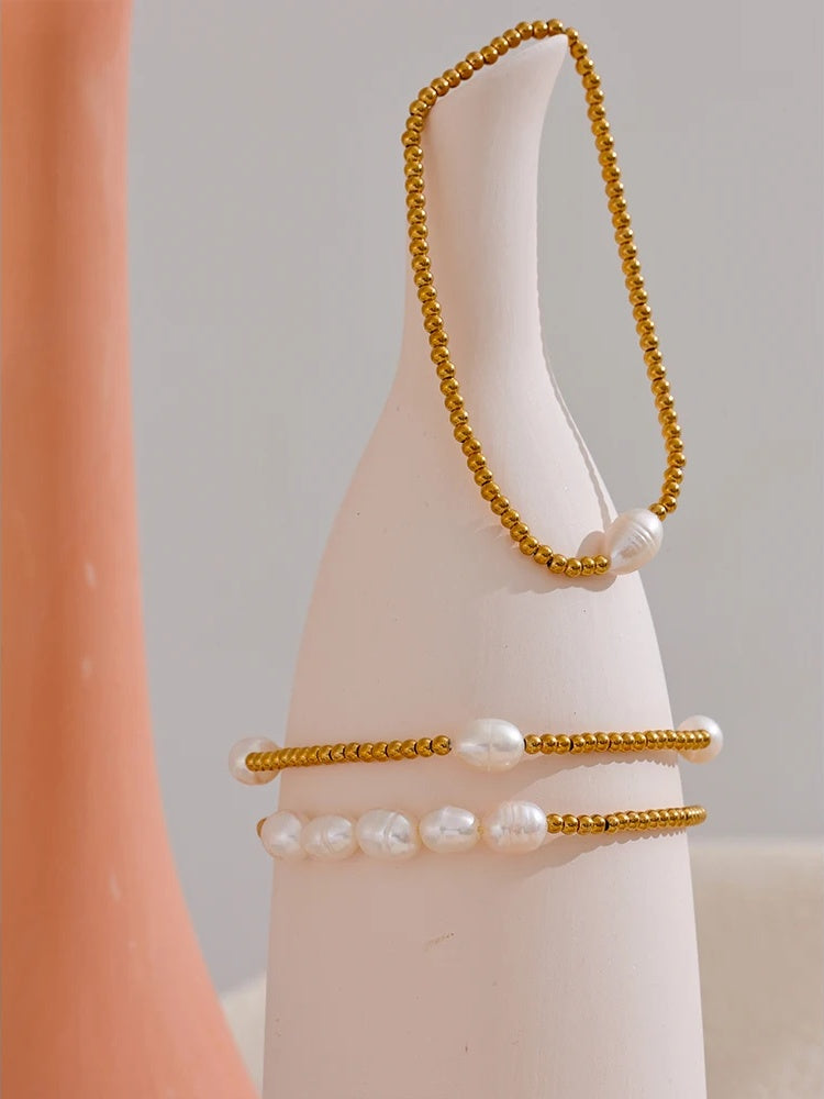 Elevate your everyday stack with a bracelet that balances softness and structure. Natural freshwater pearls meet polished stainless steel beads in a refined, geometric rhythm, while PVD real gold plating lends a warm, modern glow designed to stand up to daily wear.
