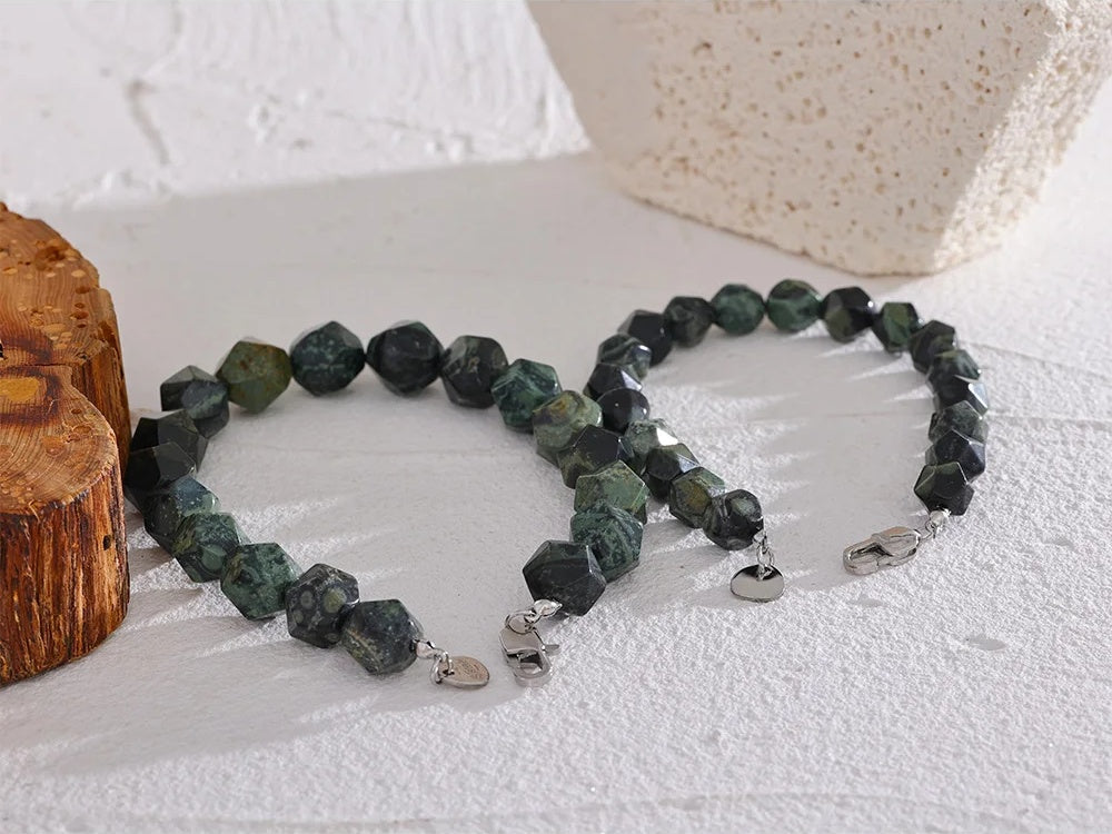 Crafted from natural malachite stone beads, this bracelet offers a unique geometric design that combines both style and substance. The beads are strung together with a durable stainless steel chain, secured by a lobster-claw clasp for reliable wear. Suitable for both men and women, it features a trendy look that complements various outfits while providing a versatile accessory option. Available in different lengths to ensure a comfortable fit.