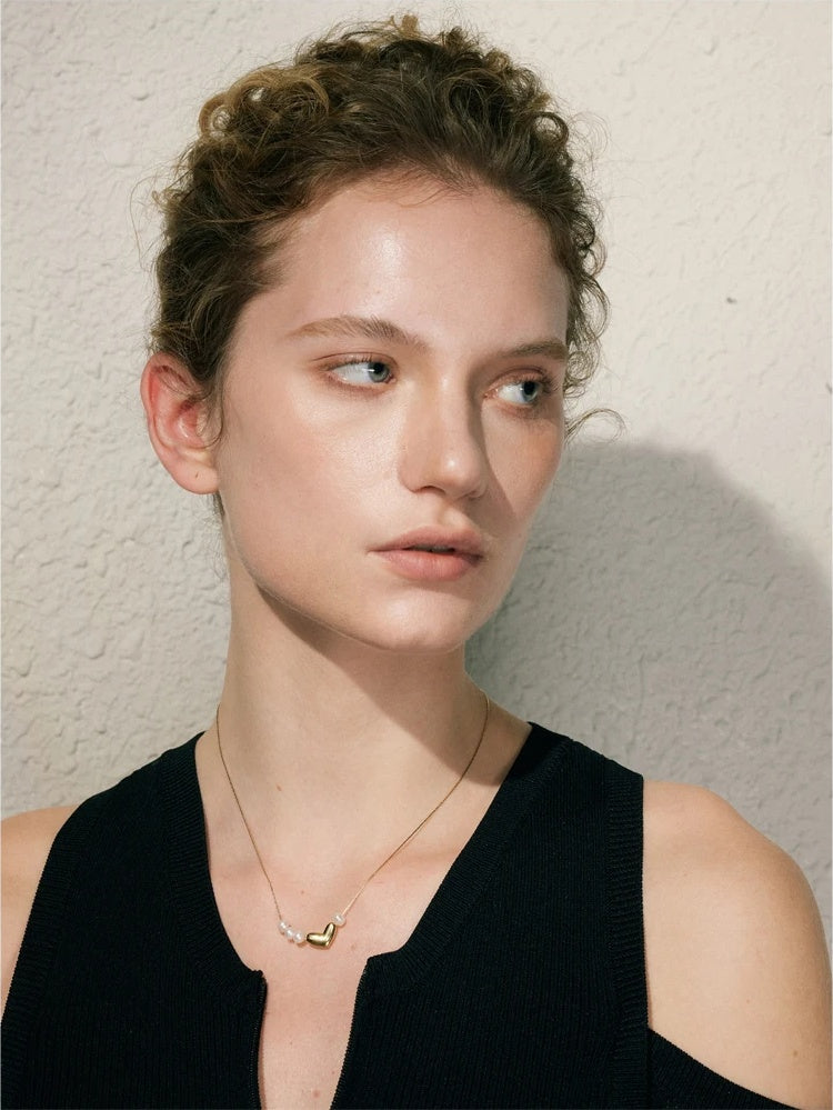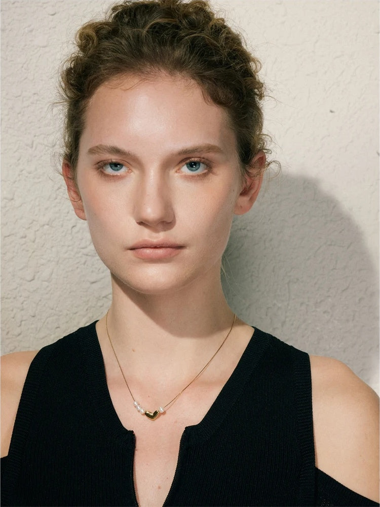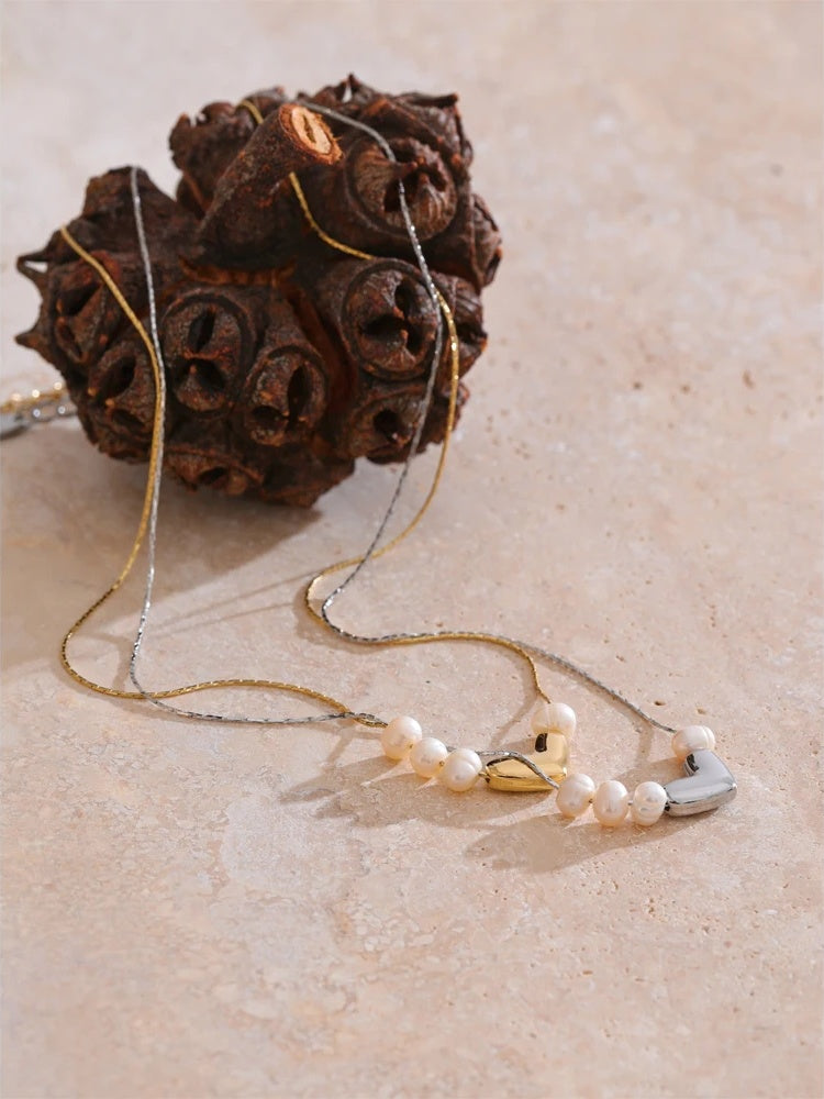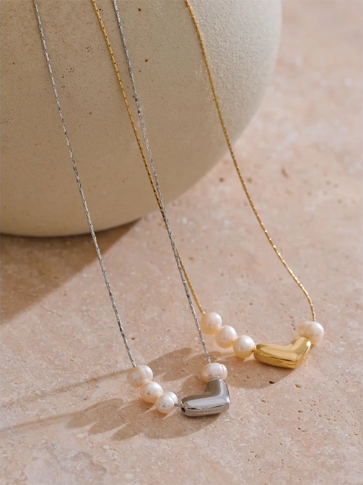 A delicate heart-shaped pendant crafted from stainless steel with a polished gold finish offers a timeless look. Freshwater pearls are artfully arranged alongside the pendant, adding natural elegance and a soft luster. The necklace is designed for versatile wear, complementing both casual and formal styles. Lightweight and comfortable, it makes an excellent gift choice for special occasions.