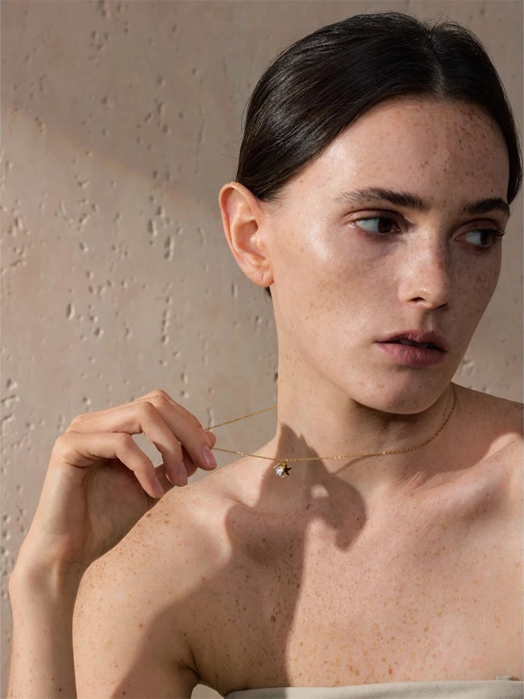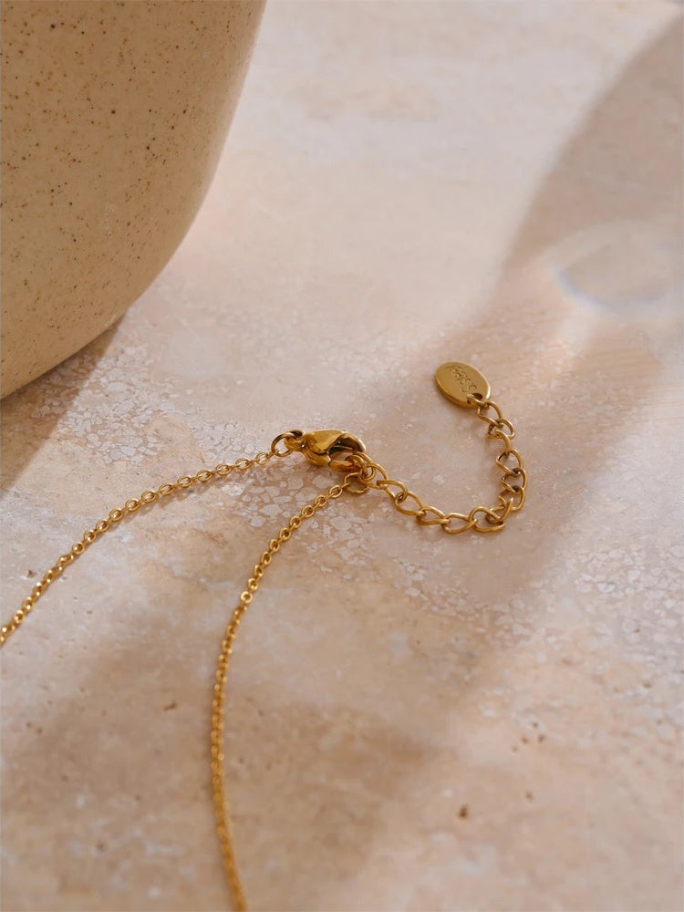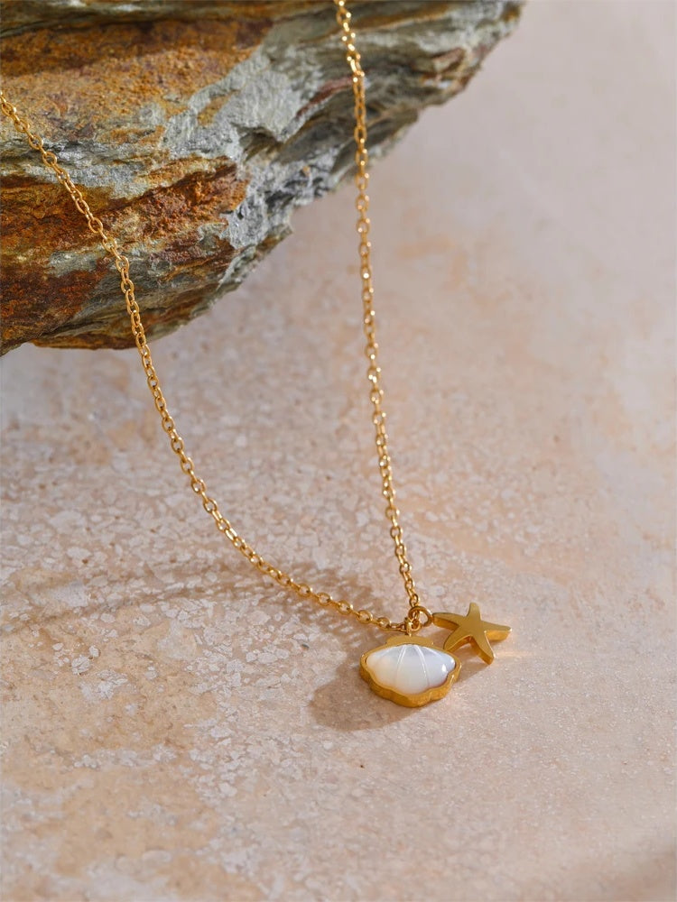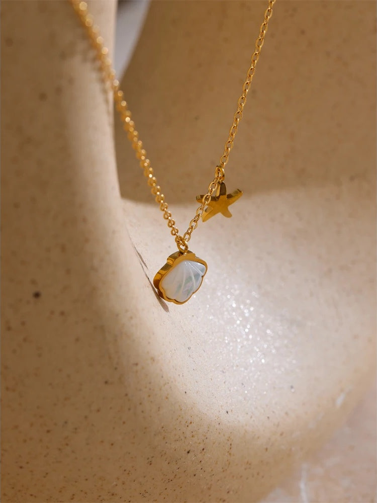 A delicate necklace featuring a starfish and natural shell pendant crafted from thicker stainless steel with a polished gold-tone finish. The shell's iridescent quality contrasts beautifully with the smooth metallic starfish, creating a geometric and modern look. Electroplated with real gold, this piece resists tarnishing and is designed for lasting wear. Lightweight and stylish, it complements a variety of outfits while offering a subtle yet distinctive accessory choice.