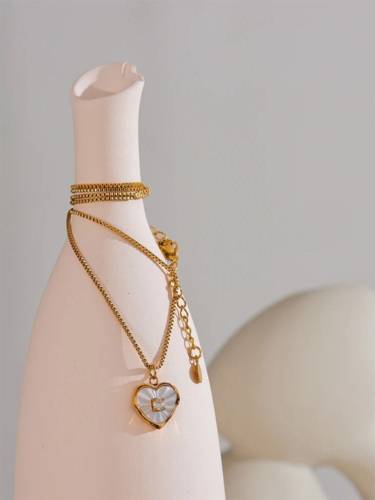 Timeless and softly luminous, this heart pendant necklace showcases a natural shell centerpiece with subtle iridescence. A single sparkling zircon accent sits within a polished stainless steel frame, offered with an optional real gold PVD finish for a warm, refined glow. Lightweight and hypoallergenic, it’s designed for effortless, all-day wear.