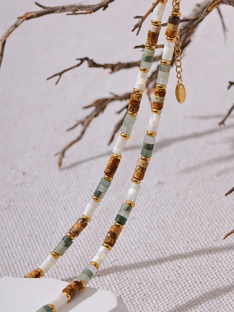 Handcrafted with natural stone beads and stainless steel accents, this necklace offers a unique geometric design that complements any outfit. The PVD real gold plating adds durability and a waterproof finish, ensuring long-lasting wear. Designed with a trendy style in mind, it provides a versatile accessory suitable for various occasions. Lightweight and comfortable, it is an ideal piece for everyday elegance.