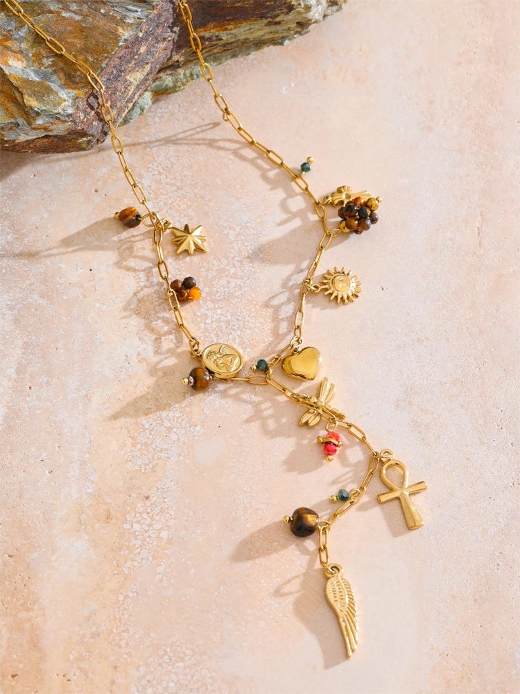 Crafted from stainless steel with a PVD real gold plating, this necklace features an array of charming pendants including a dragonfly, cross, heart, and wing, accented with natural stone beads. The geometric design elements and fine detailing create a trendy, eye-catching accessory suitable for everyday wear. Lightweight and comfortable, it complements various outfits while offering durability and style. Perfect for those seeking a unique statement piece with symbolic motifs.