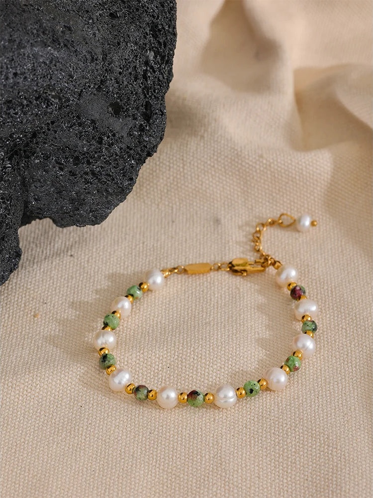 Featuring a delicate combination of oval freshwater pearls and natural stone beads, this bracelet offers a refined geometric design. Crafted with stainless steel and finished with a real gold PVD plating, it ensures durability and a polished look. The lobster-claw clasp provides secure wear, while the waterproof construction adds practicality for everyday use. Suitable for all occasions, it complements a variety of styles effortlessly.