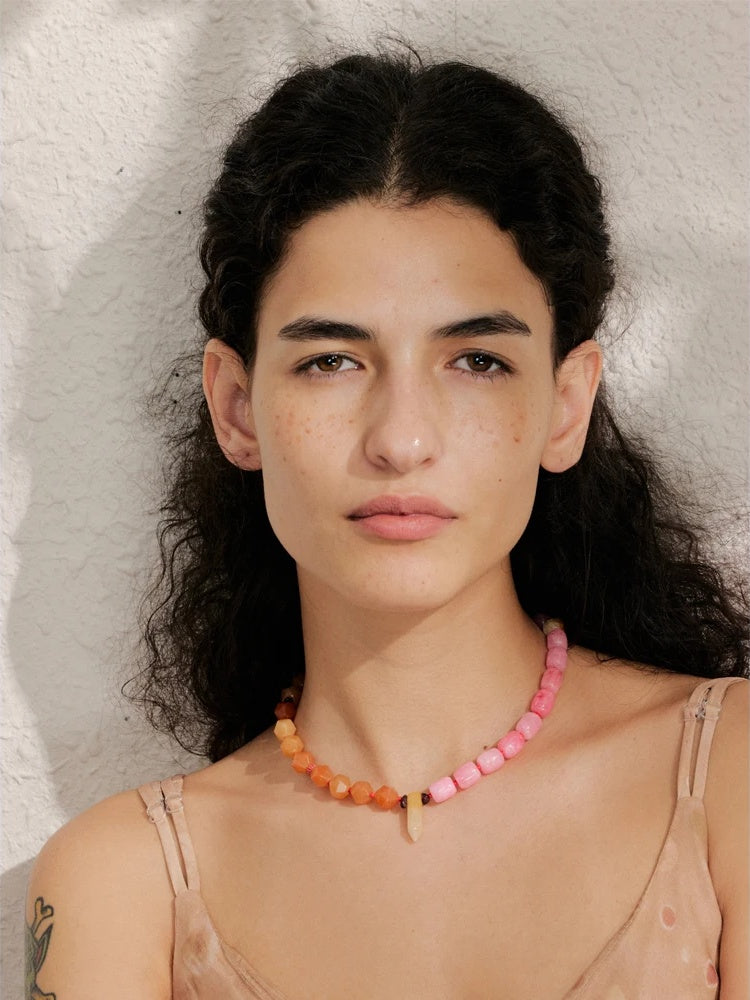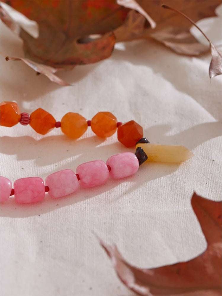 A fresh take on dainty gemstone jewelry, this handcrafted necklace showcases natural stone beads in warm orange and soft pink tones, arranged in a clean, geometric silhouette. The stones are paired with a sleek stainless steel chain plated with real gold for a polished, long-lasting finish.