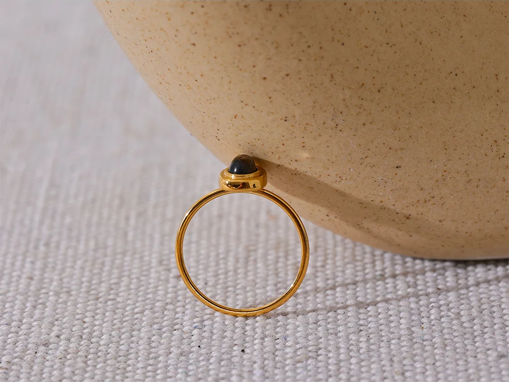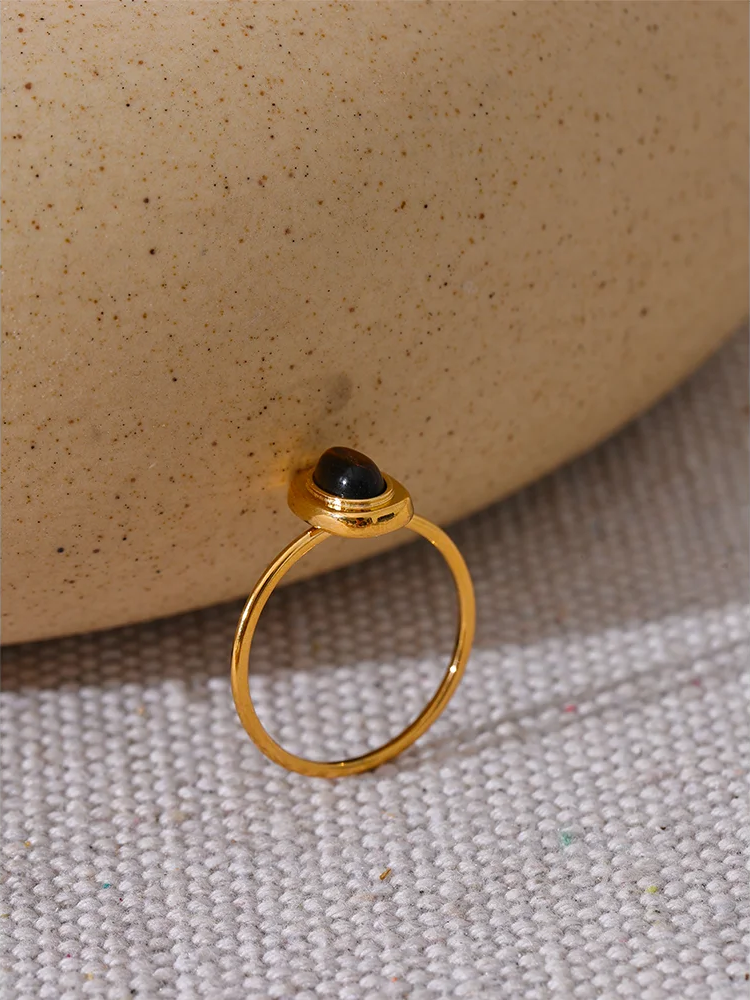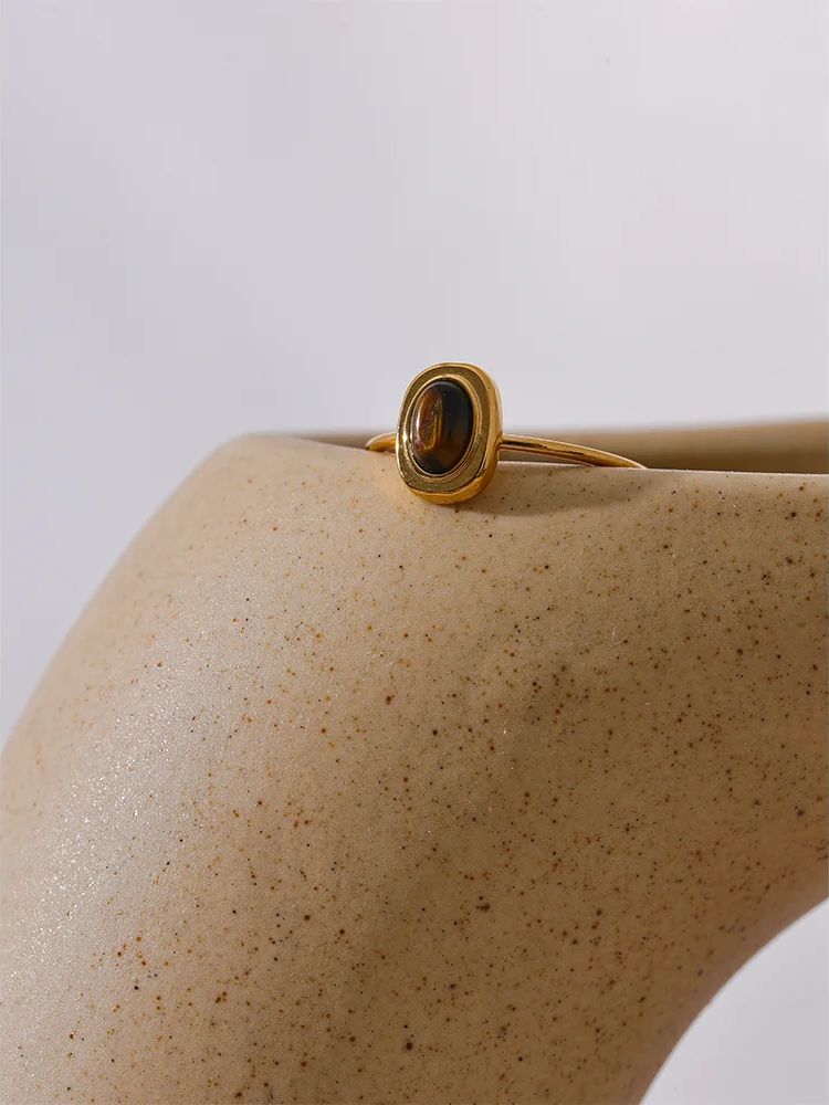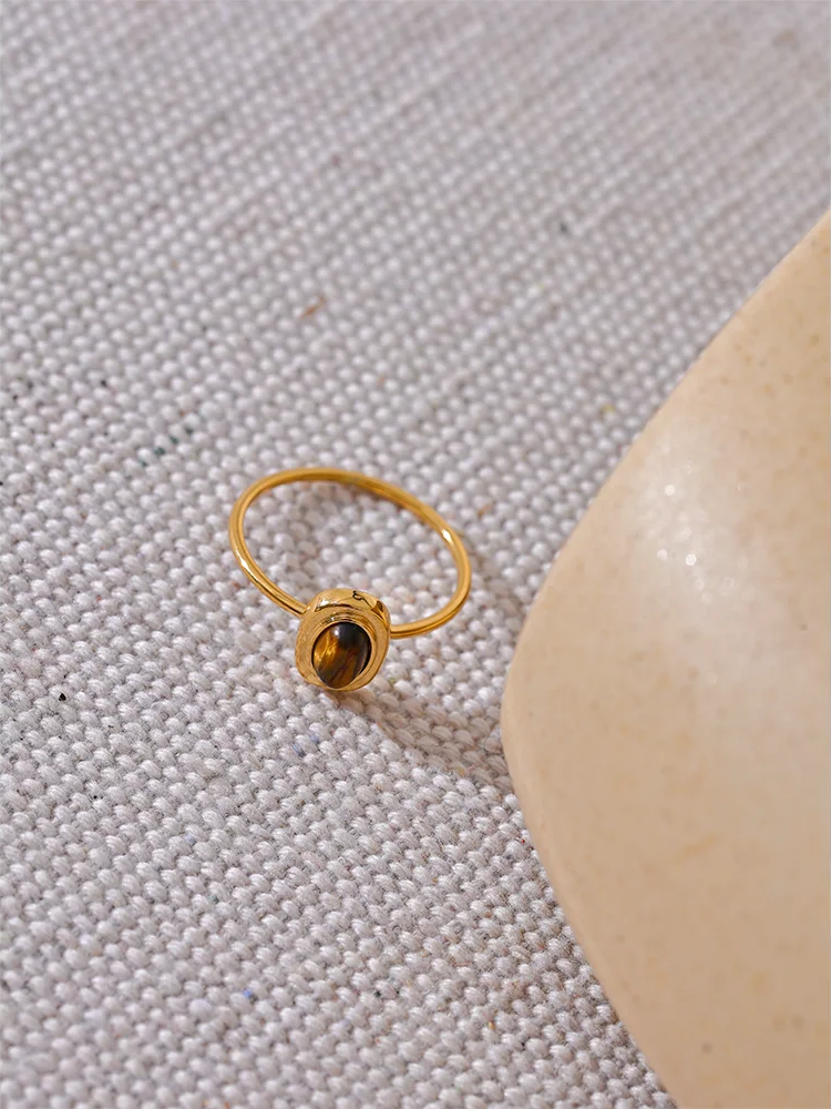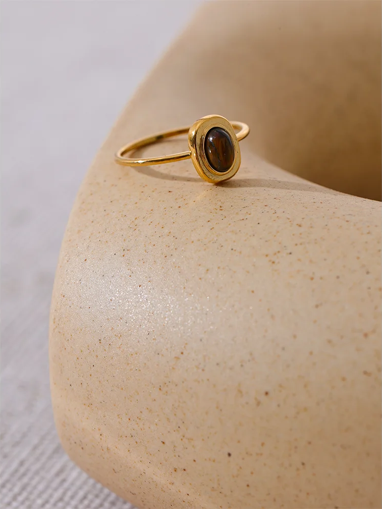 Featuring a thin, chic band crafted from durable stainless steel with an 18k PVD gold plating, this ring offers both style and longevity. The oval natural stone centerpiece is securely set with a glue setting, showcasing a unique geometric design. Lightweight and waterproof, it is suitable for everyday wear or special occasions. Available in multiple ring sizes, it complements a variety of fashion looks.