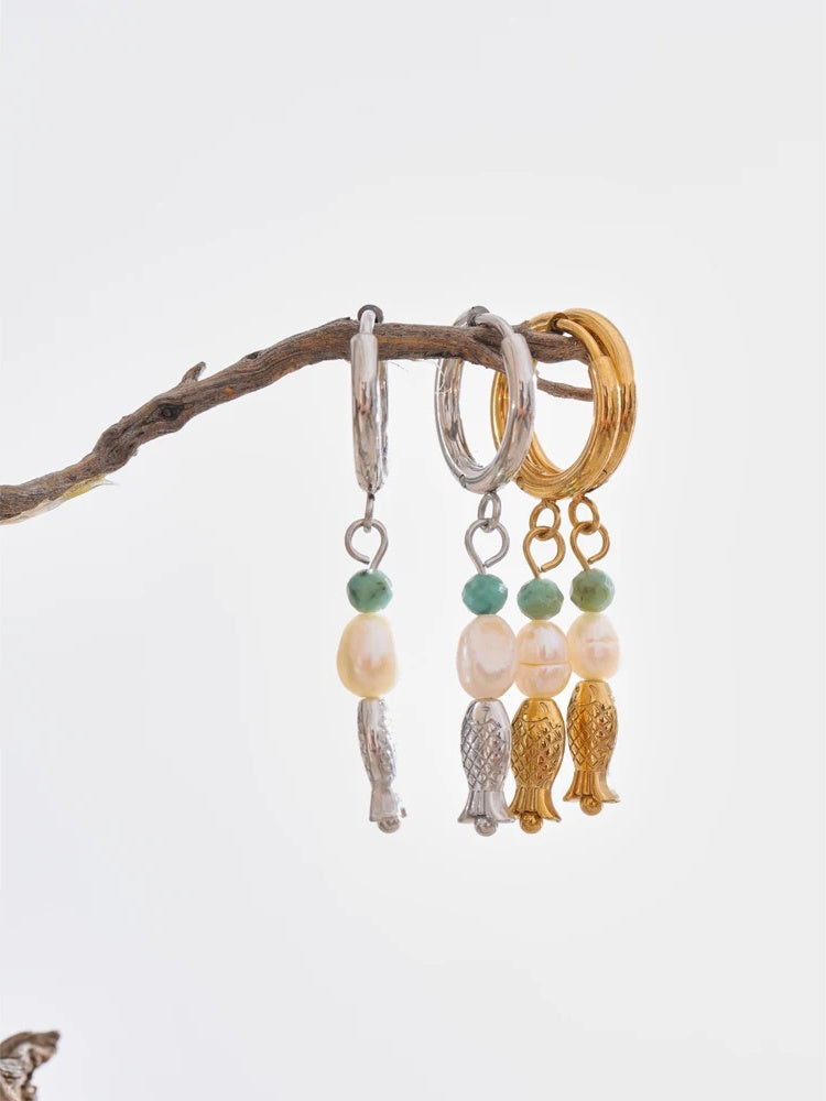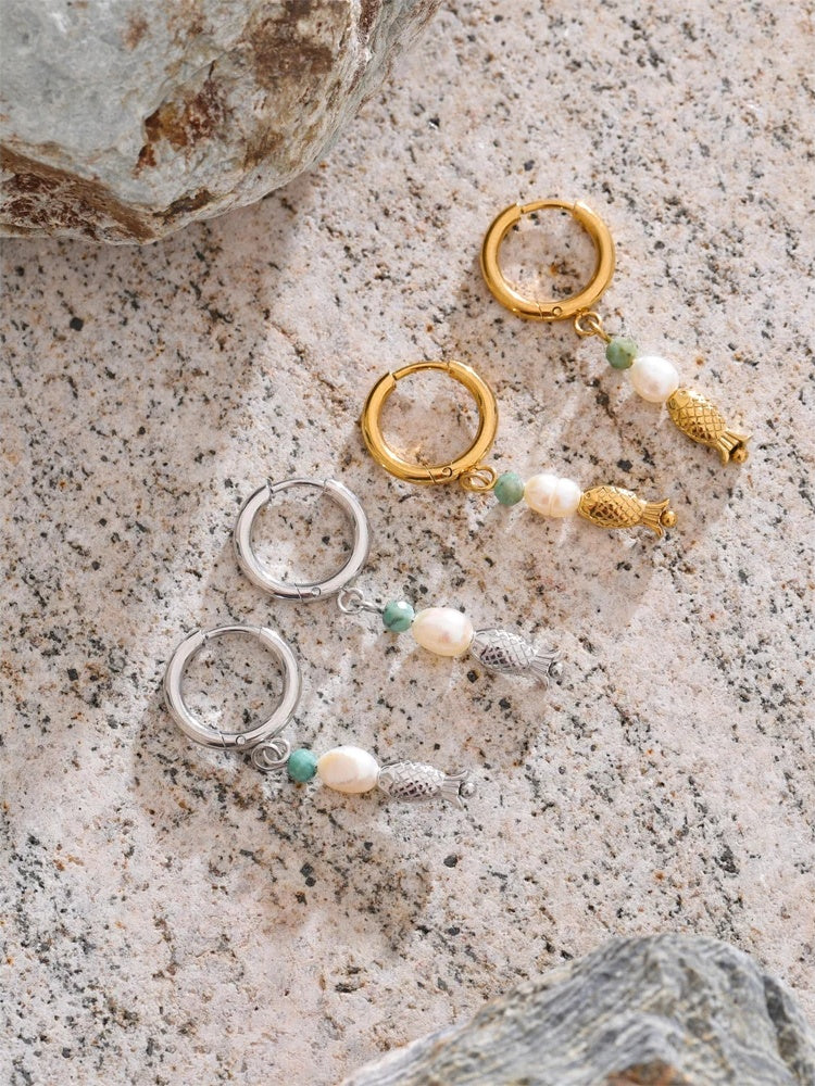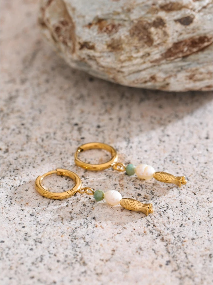 Crafted from stainless steel with a durable PVD plating, these dangle earrings feature freshwater pearls paired with natural stone beads for a unique ocean-inspired design. The geometric fish charm adds a playful yet elegant touch, making them suitable for both casual and dressy occasions. Lightweight and waterproof, they offer lasting comfort and shine. Available in both gold and platinum finishes to complement various styles.