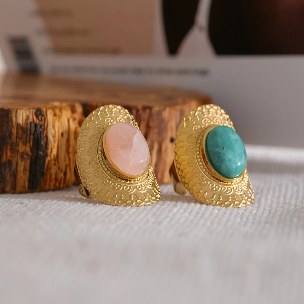 Featuring an adjustable design for a perfect fit, this ring combines natural stones in pink, green, turquoise, and white hues with a stainless steel band. The 18k gold-plated finish offers lasting shine and durability, complemented by intricate geometric detailing. Ideal for parties or casual wear, the tension mount setting highlights the unique stones, making each piece a standout accessory.
