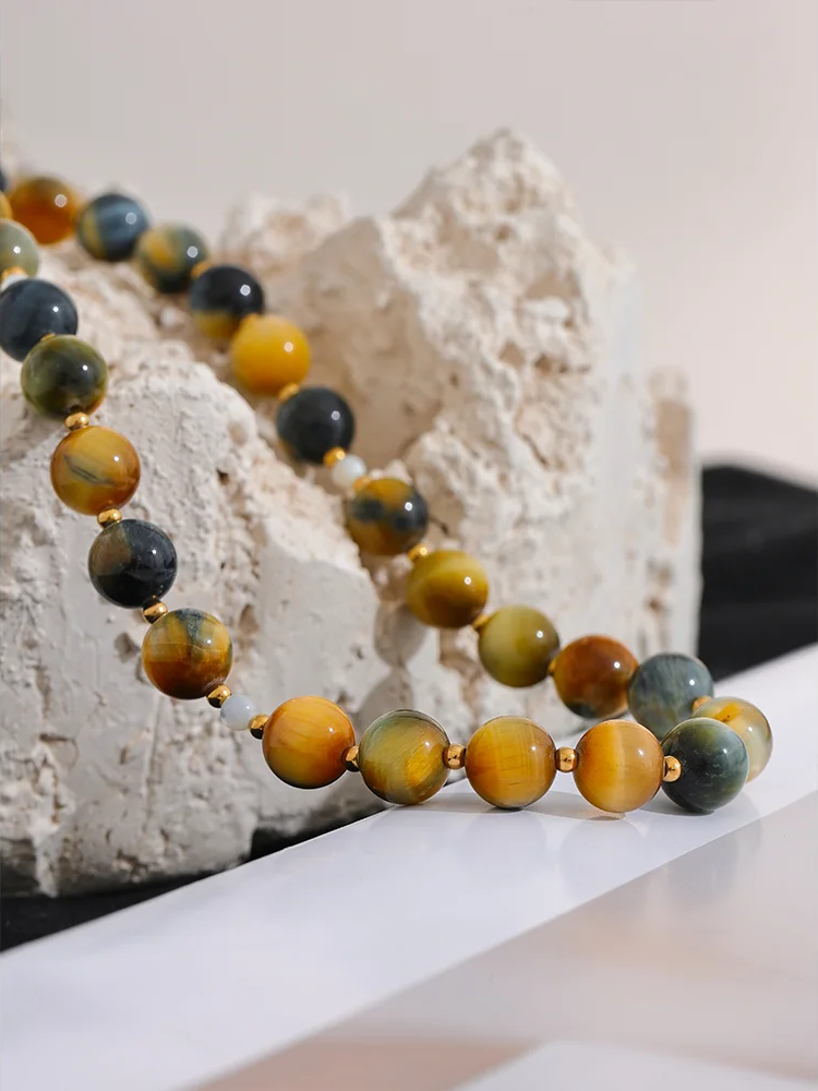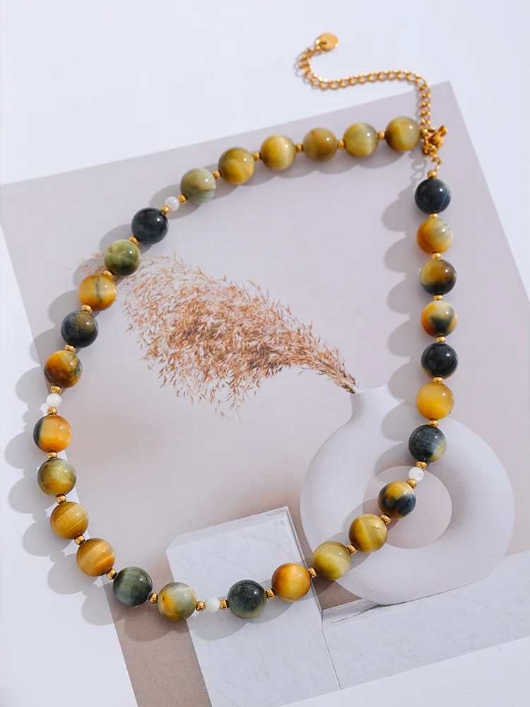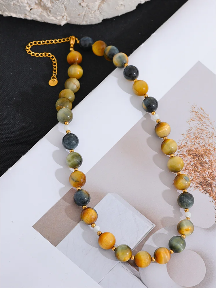 Crafted with round natural tiger stone beads, this pendant necklace showcases earthy tones and subtle color variations for a unique look. Stainless steel elements offer durability and resistance to water, making it suitable for everyday wear. The polished beads are complemented by small gold-toned spacers, adding a refined contrast. Designed with a trendy style, it serves as a versatile accessory for various outfits.