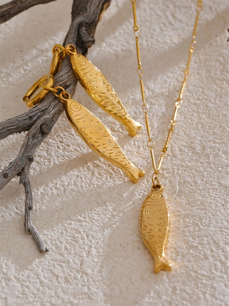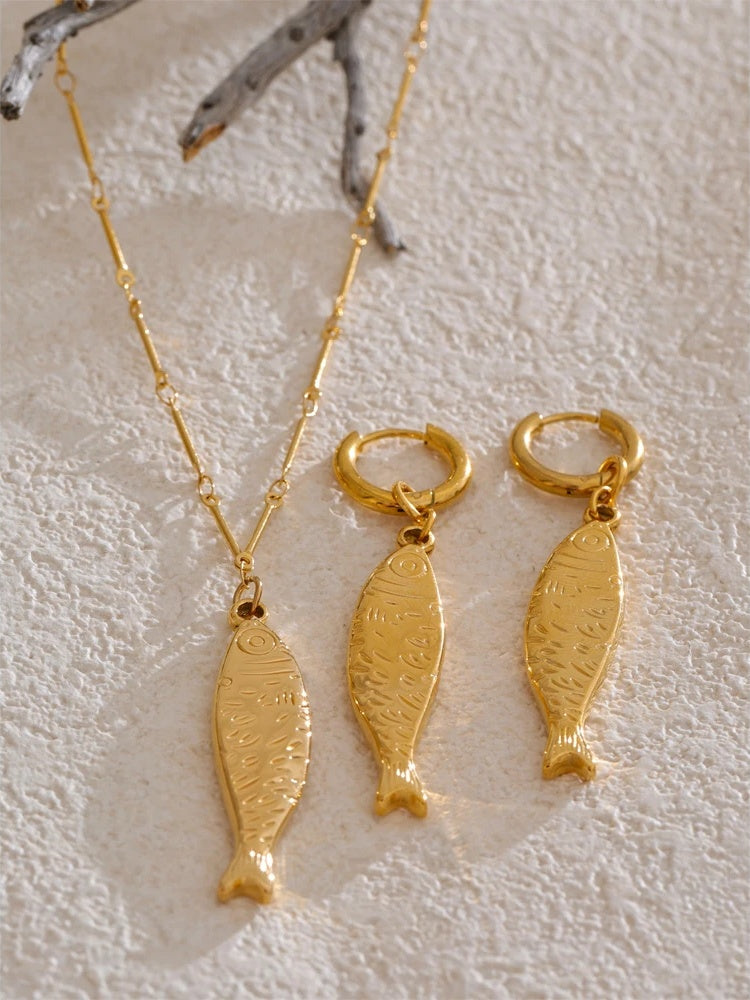 A gold-colored metal jewelry set featuring a fish pendant design, crafted from stainless steel with a durable PVD real gold plating for rust resistance. The set includes a necklace with a detailed fish pendant and matching hoop earrings, both showcasing intricate textural details. Designed with a trendy geometric pattern, this set is suitable for party wear and adds a unique accent to fashionable outfits.