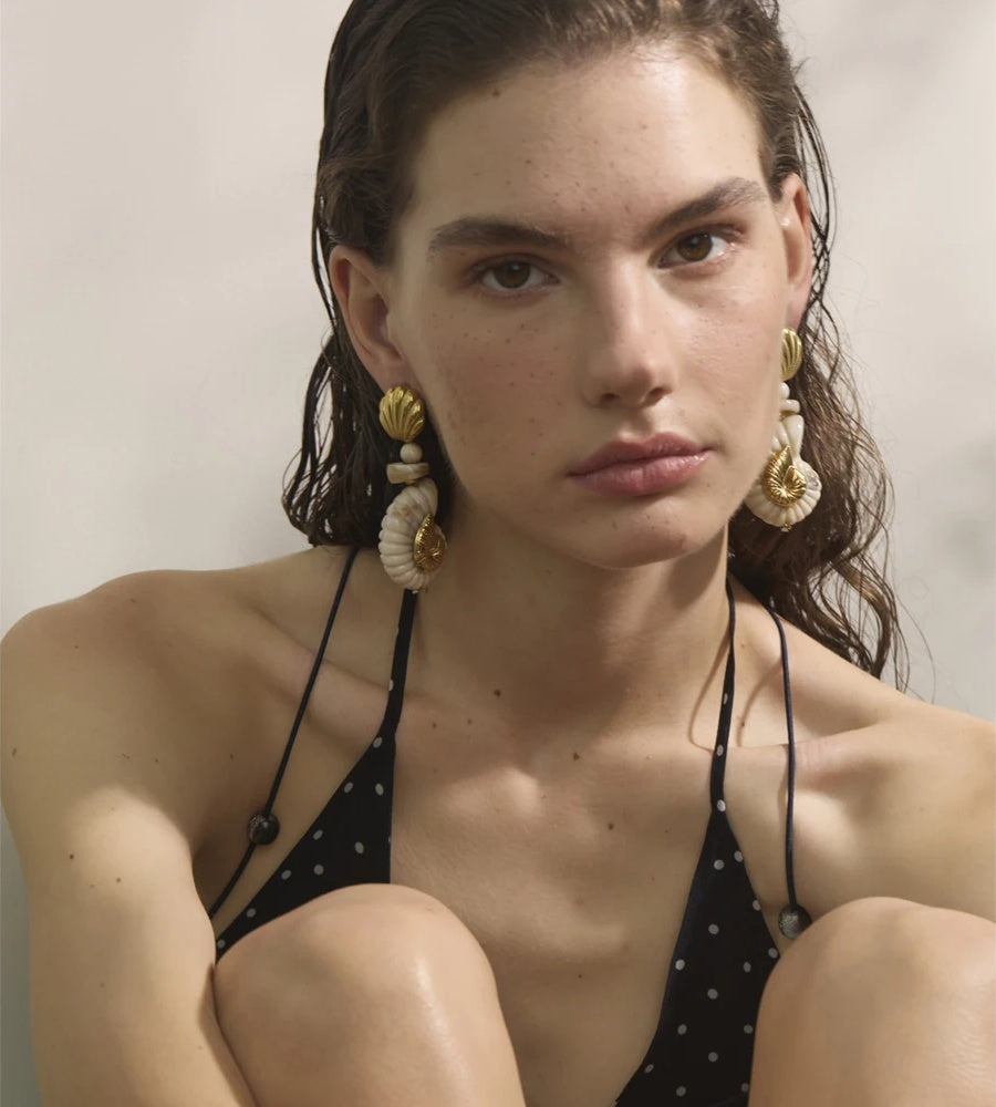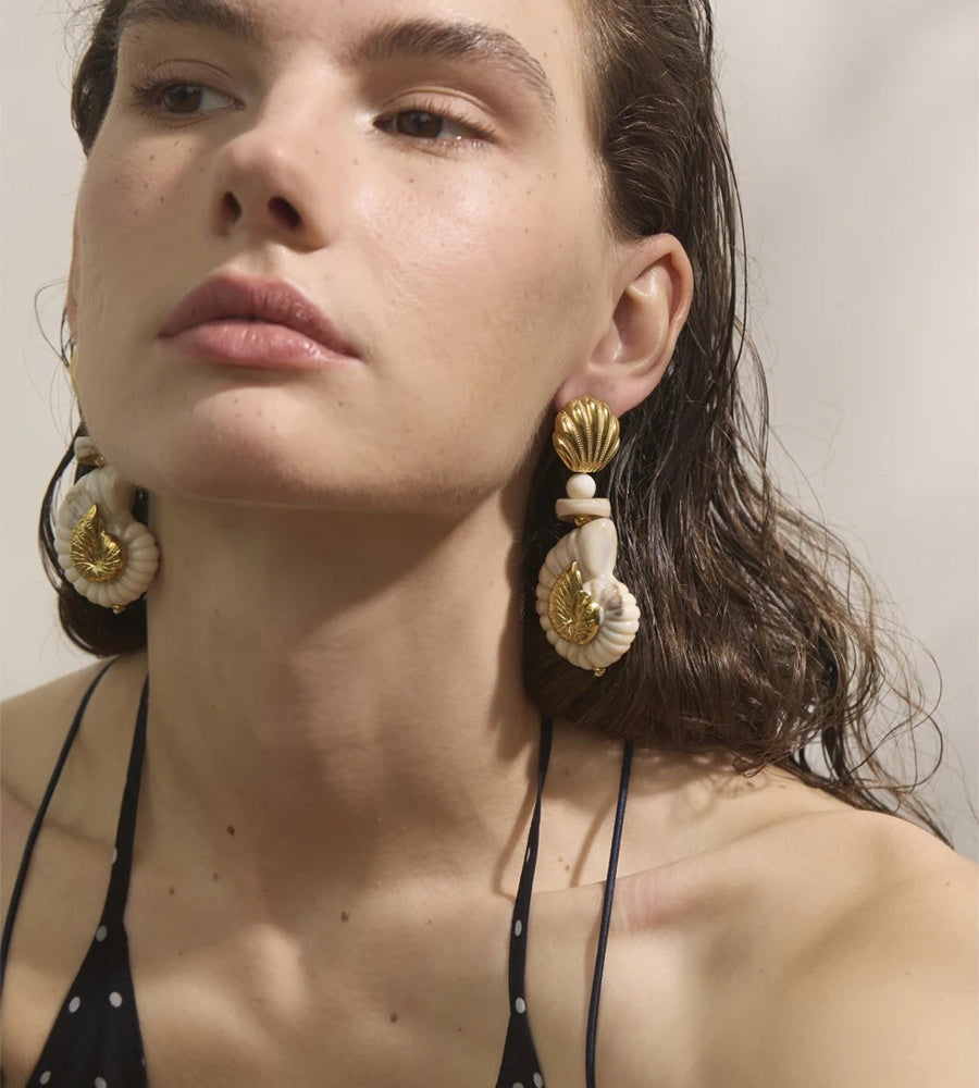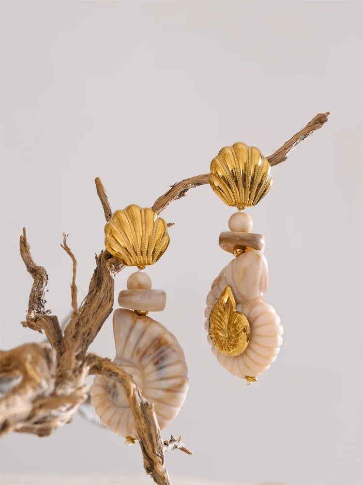 Crafted with a combination of resin shell and stainless steel, these drop earrings showcase a unique conch shell design accented with gold-colored plating. The textured shell and geometric shapes evoke a coastal, summery vibe, perfect for daily wear or holiday occasions. Lightweight and durable, they add an artistic touch to any outfit while ensuring long-lasting comfort.