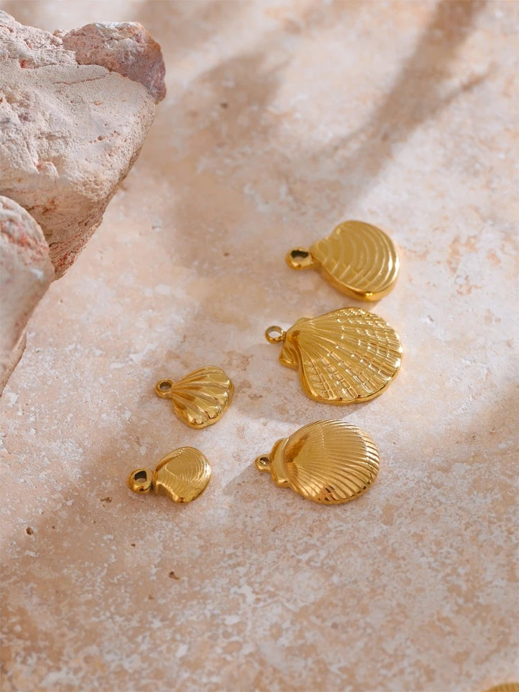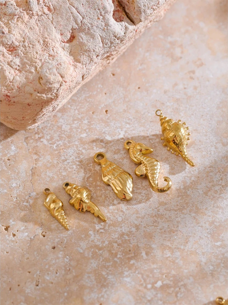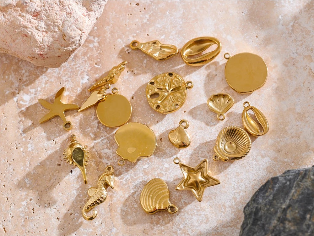 A collection of ocean-inspired pendants crafted from durable stainless steel with a real gold PVD plating. Each charm features detailed designs including starfish, seahorses, shells, and conch shapes, perfect for handmade necklaces or DIY jewelry projects. These lightweight and corrosion-resistant pendants offer versatility for custom accessories, making them ideal for summer-themed creations.
