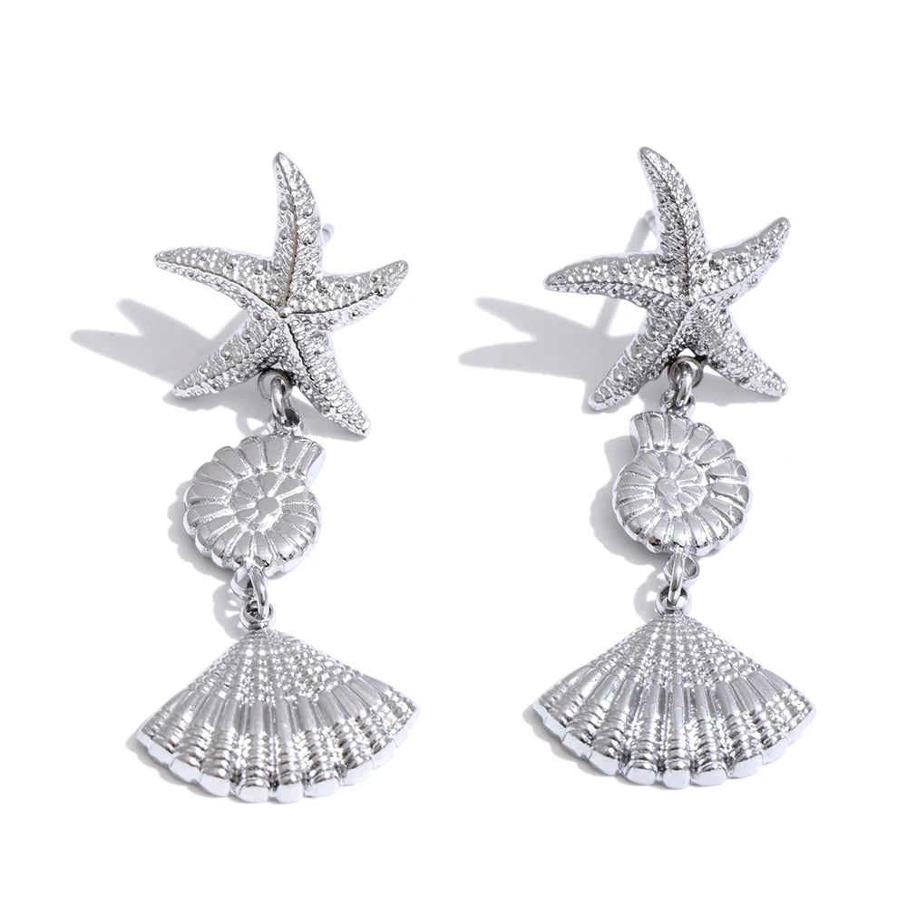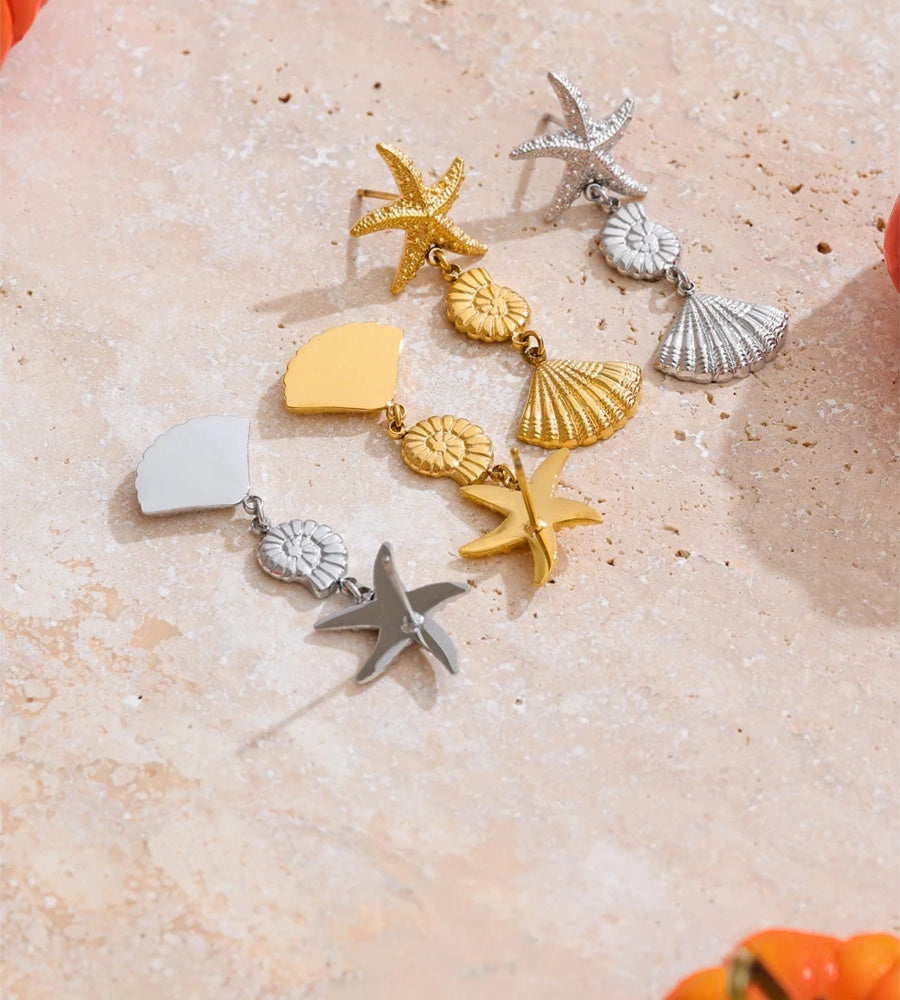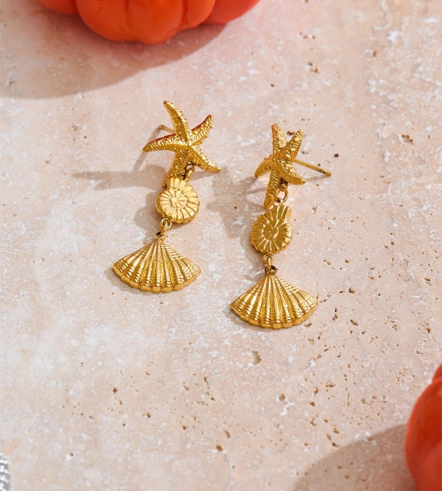 Featuring detailed ocean-inspired charms, these drop earrings showcase a starfish, conch shell, and scallop shell design. Crafted from gold-colored stainless steel with a PVD real gold plating, they offer both durability and a radiant finish. Lightweight and perfect for daily wear, these earrings bring a trendy, beach-ready vibe to any outfit.
