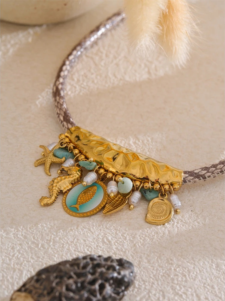Featuring a unique ocean-inspired design, this necklace combines lustrous pearls with delicate starfish, seahorse, fish, and shell charms. The centerpiece is crafted from stainless steel with a PVD real gold plating, adding durability and a rich golden finish. The textured cord adds a modern touch, complementing the intricate marine elements for a trendy and eye-catching look. Adjustable length ensures a comfortable fit for various styles and occasions.