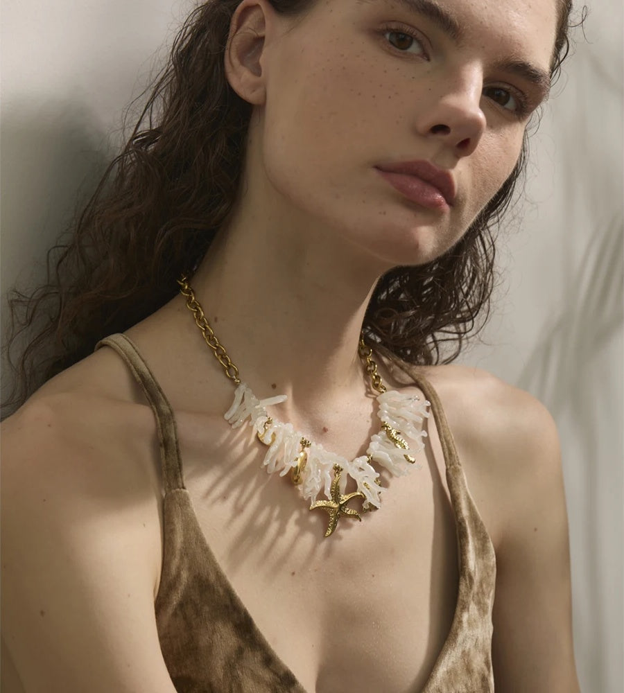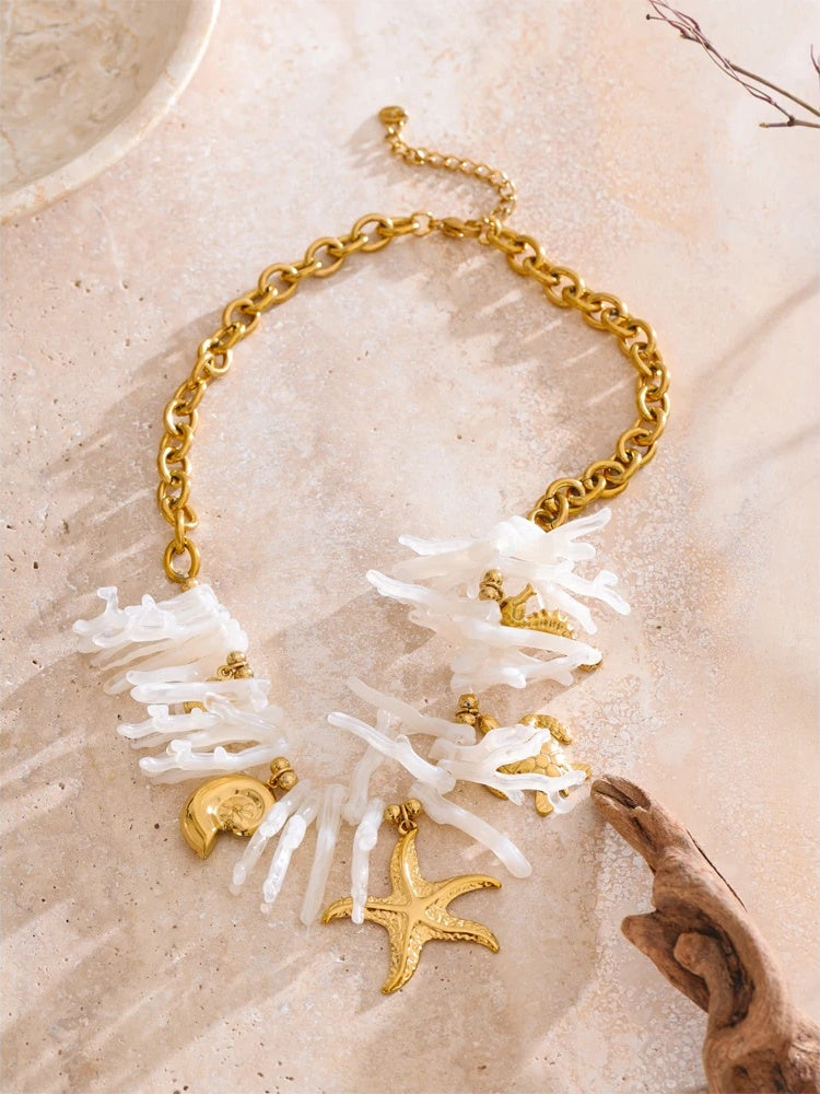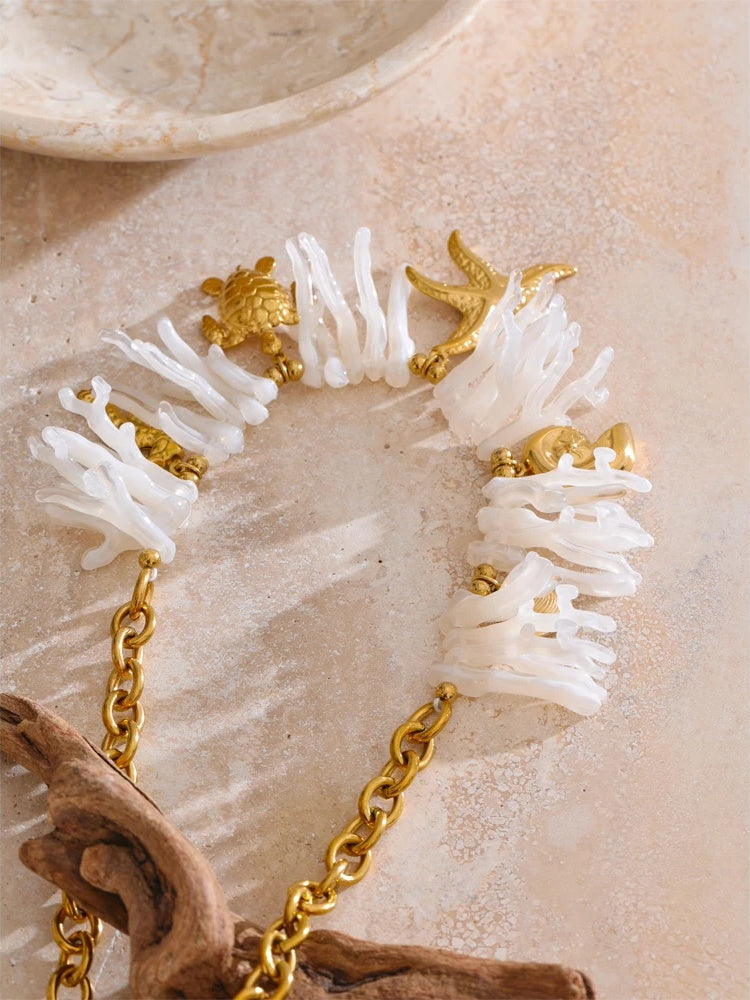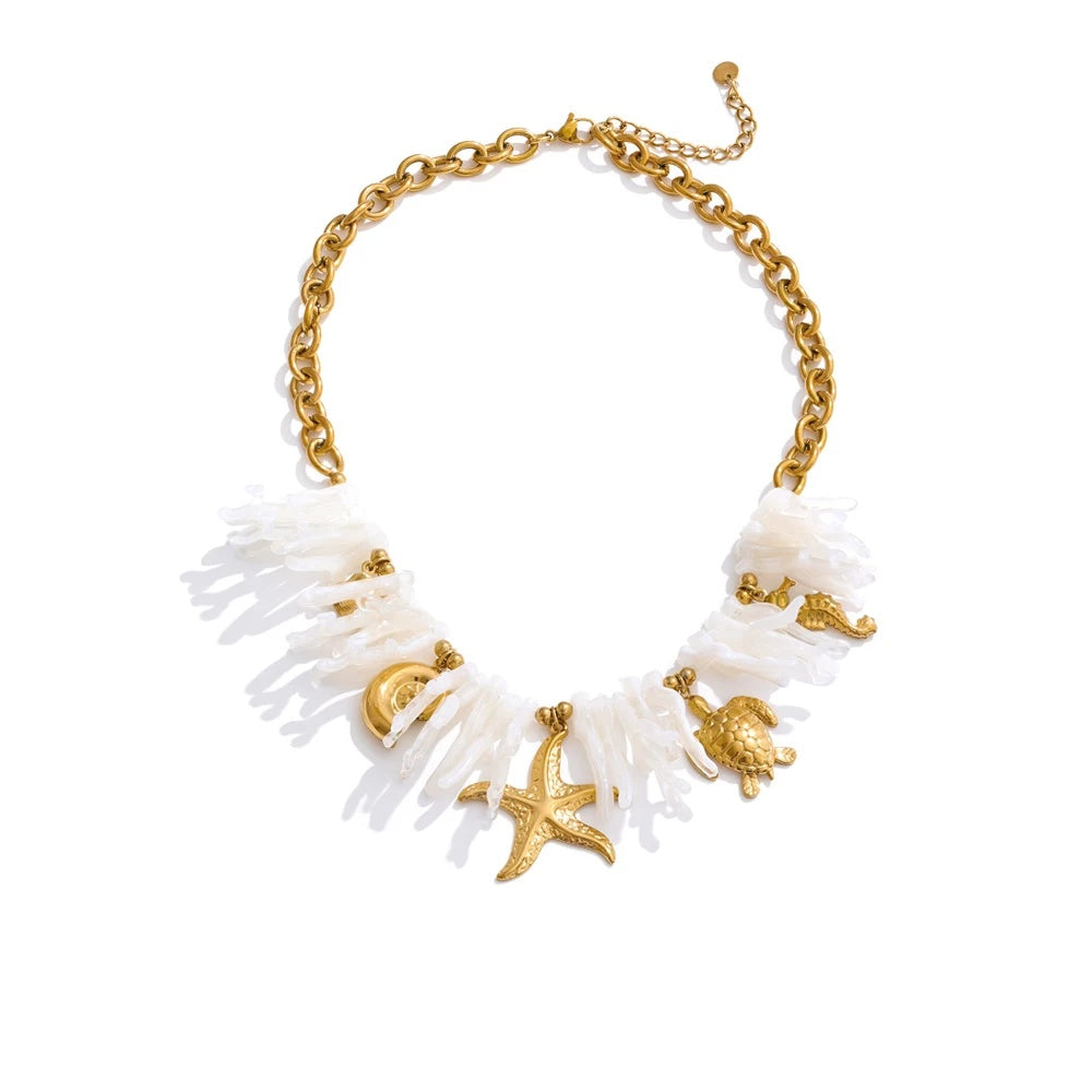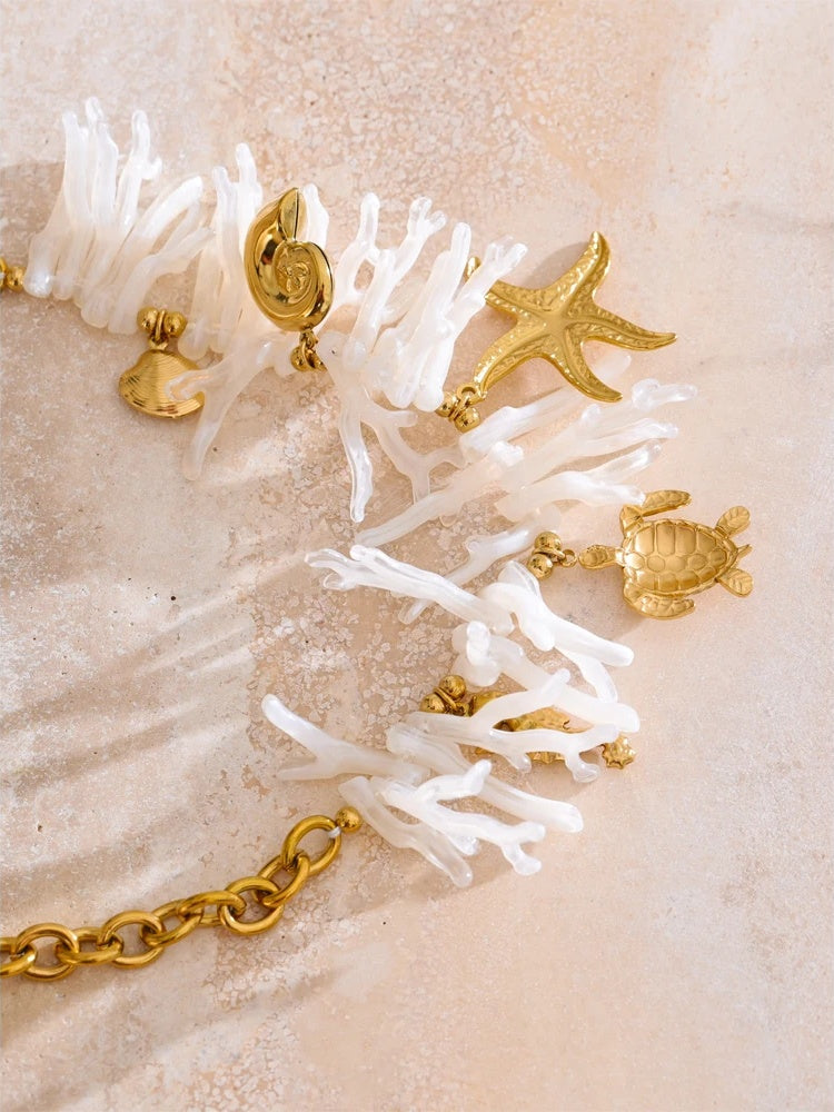 Embrace the tide with an ocean-inspired necklace that balances playful detail and polished elegance. This Hoops & Gems design pairs white resin, coral-like accents with golden marine charms—starfish, turtle, and shell—for a coastal jewelry piece that feels fresh, modern, and effortlessly wearable.