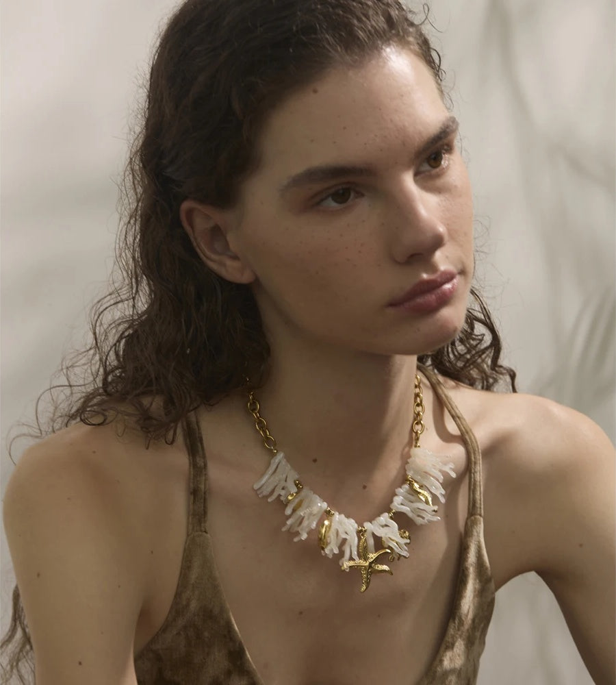 Designed for layered looks or to shine solo, this coastal statement necklace complements everything from sunlit linens to crisp button-downs. Its warm gold tone and refined textures make it a natural partner for beach days, casual weekends, and easy day-to-night styling.