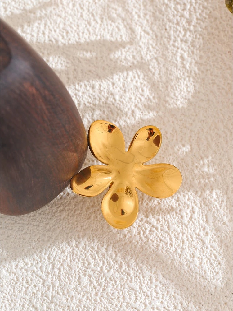 An oversized open ring crafted from durable stainless steel features a striking geometric design with a bold, modern silhouette. The piece is finished with 18k gold PVD plating, offering a rich, polished look that resists tarnishing. Adjustable sizing ensures a comfortable fit for various finger sizes, making it a versatile accessory for parties and trendy occasions. The unique combination of smooth and textured surfaces adds a dynamic touch to any outfit.