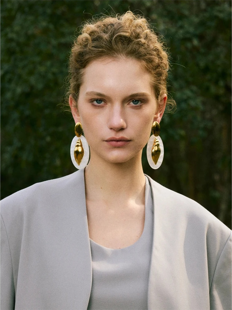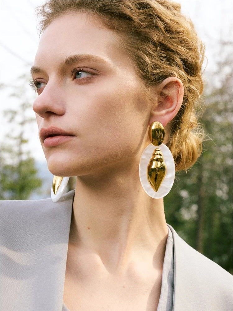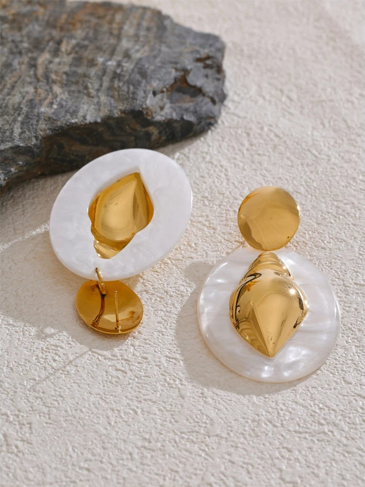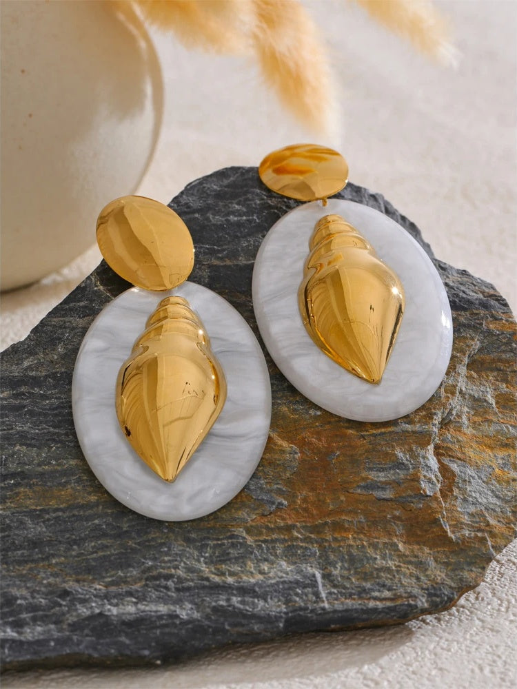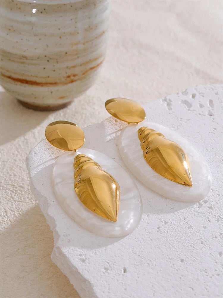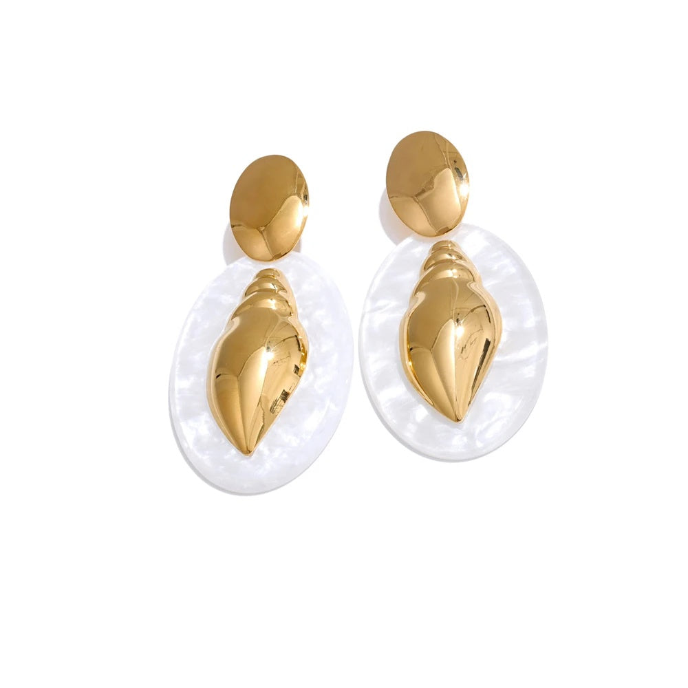 Where modern geometry meets the sea. These gold-plated earrings showcase a sleek oval acrylic base topped with a polished, conch-shaped drop—an artful balance of crisp lines and ocean-inspired curves. Crafted in smooth stainless steel with PVD real gold plating, they’re designed for durability and a radiant, long-lasting finish without the bulk.