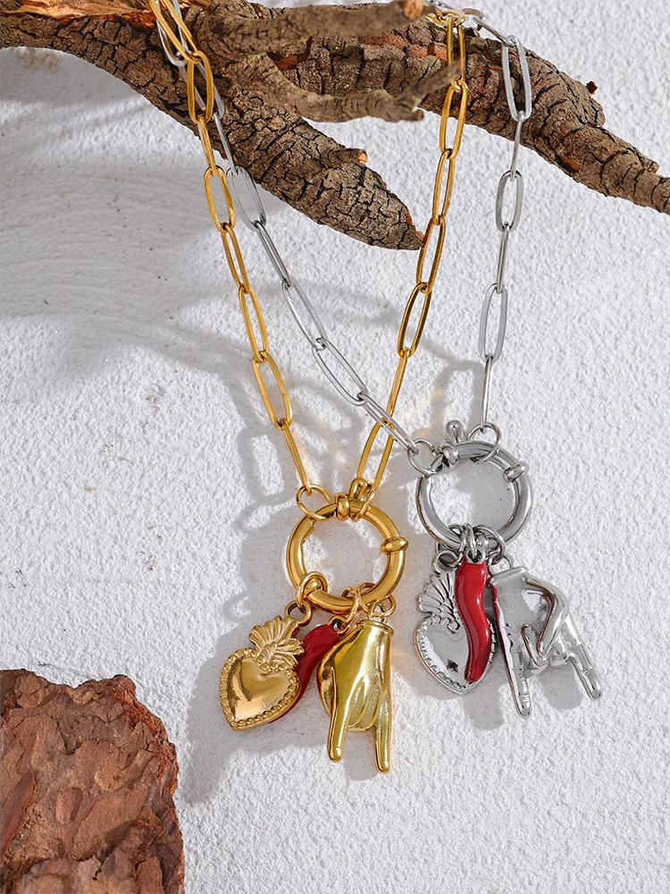 Featuring a distinctive pendant design with three unique charms—a heart, a chili pepper, and a hand gesture—this necklace seamlessly blends playful creativity with modern style. Crafted from durable 316L stainless steel with a PVD real gold plating, it offers long-lasting shine and resistance to tarnish. The geometric shapes and bold metal links create a trendy accessory suitable for everyday wear. Compatible with various outfits, it serves as a personalized jewelry piece that stands out without compromising comfort or quality.