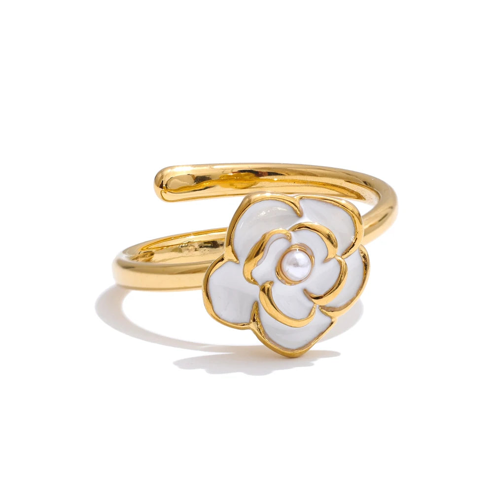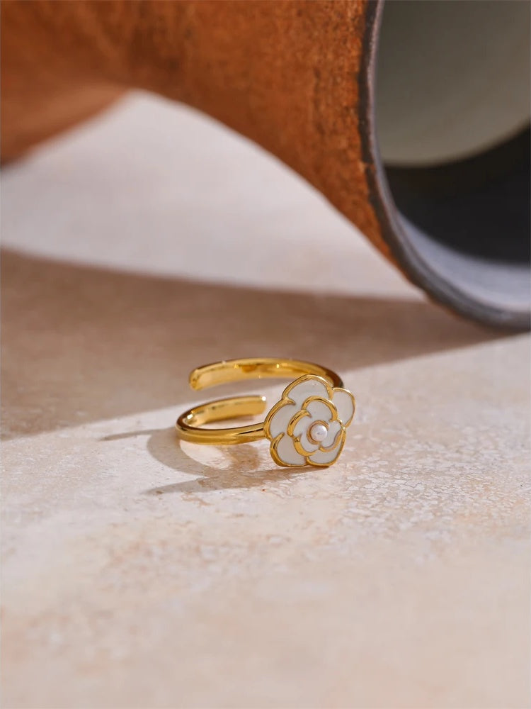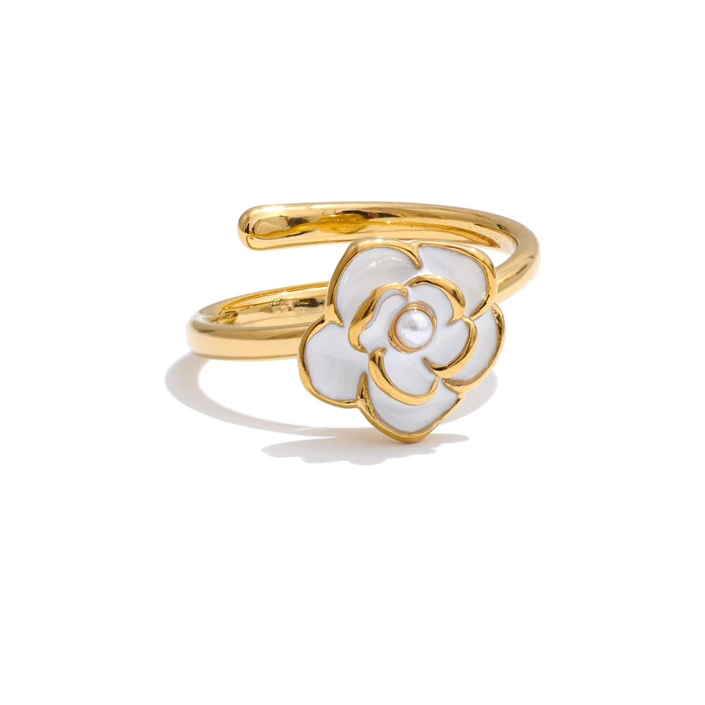 Bring a fresh, feminine glow to your everyday with this enamel flower ring, finished with a luminous pearl detail at the center. Thoughtfully crafted in stainless steel and plated in 18k gold, it balances a refined polish with the durability you want for regular wear.