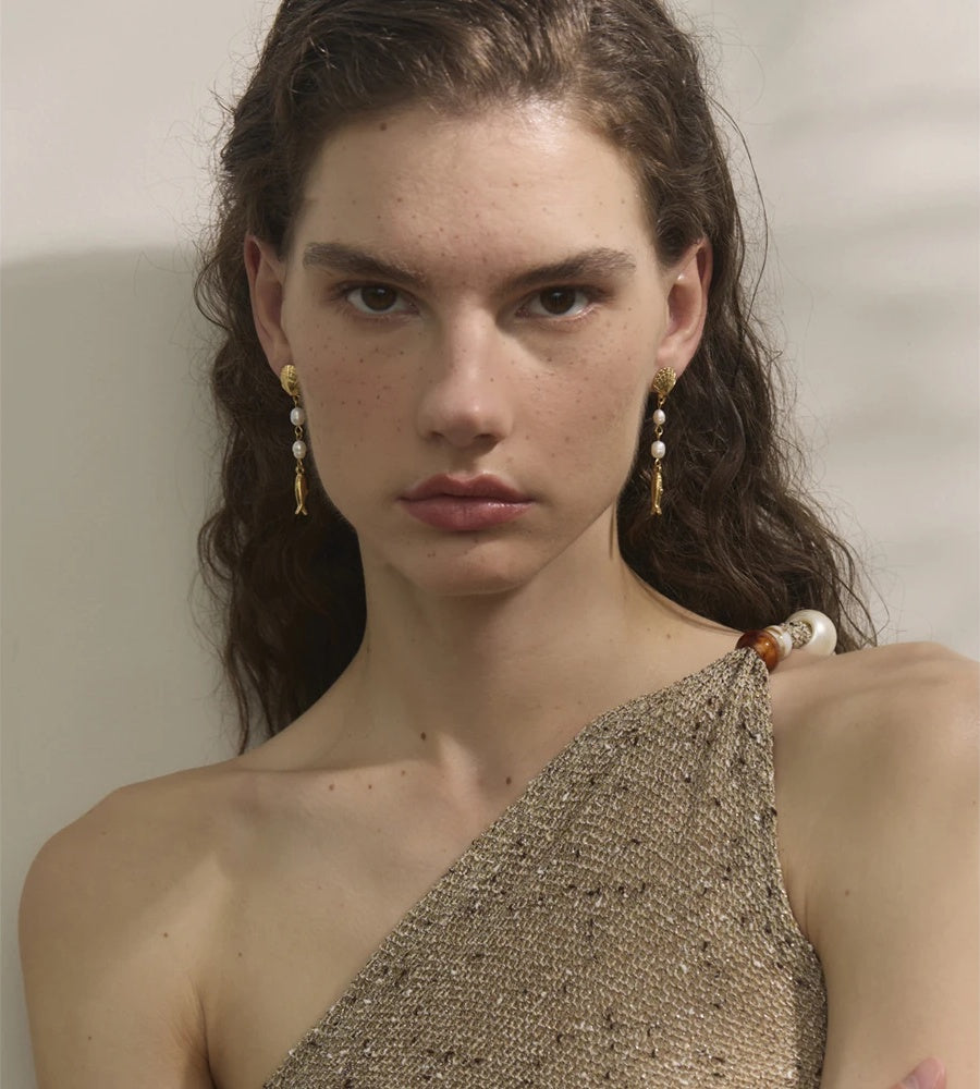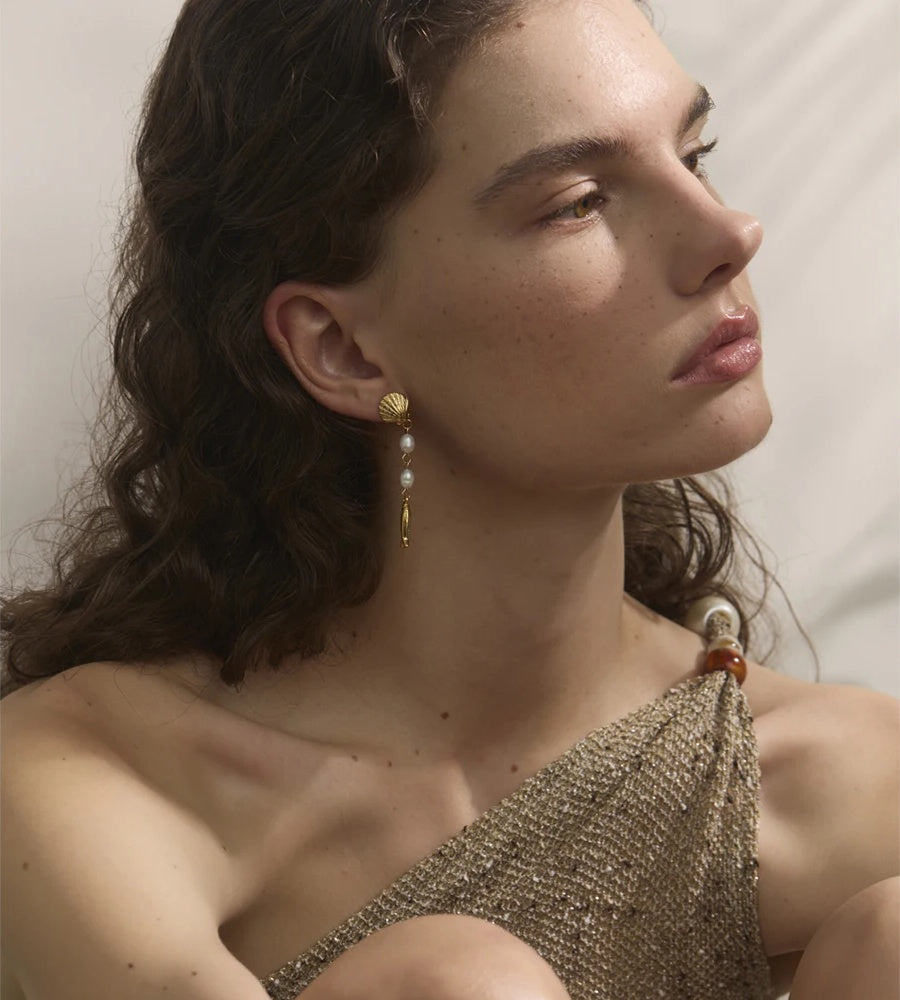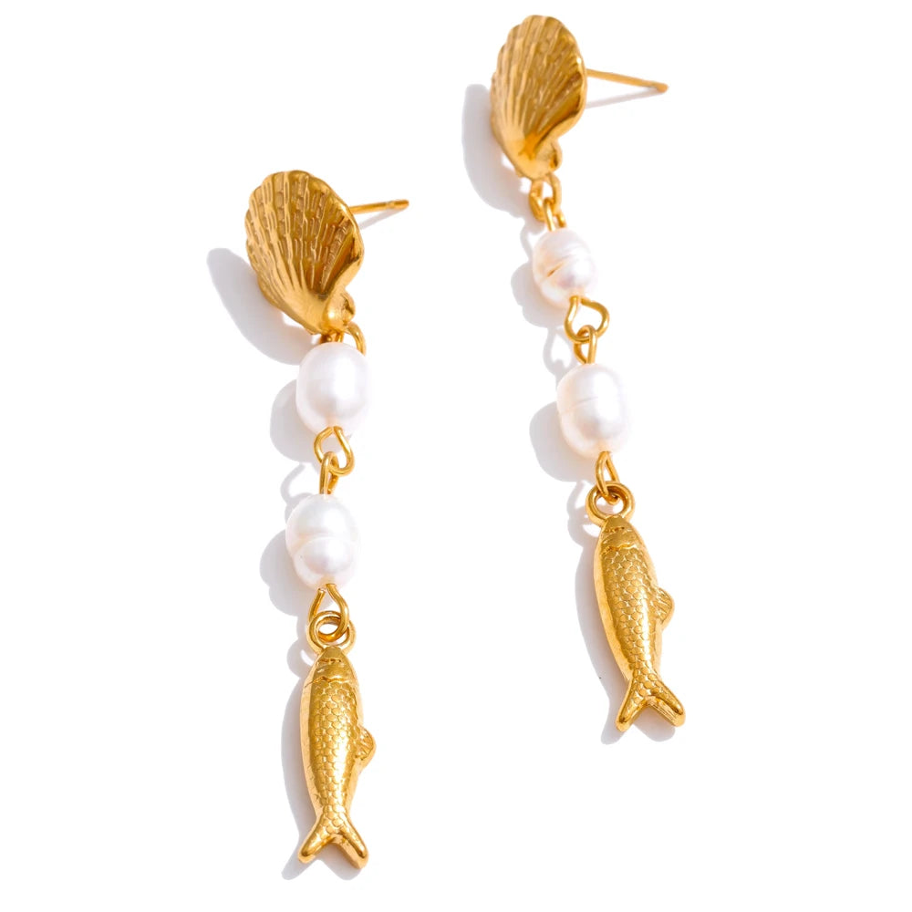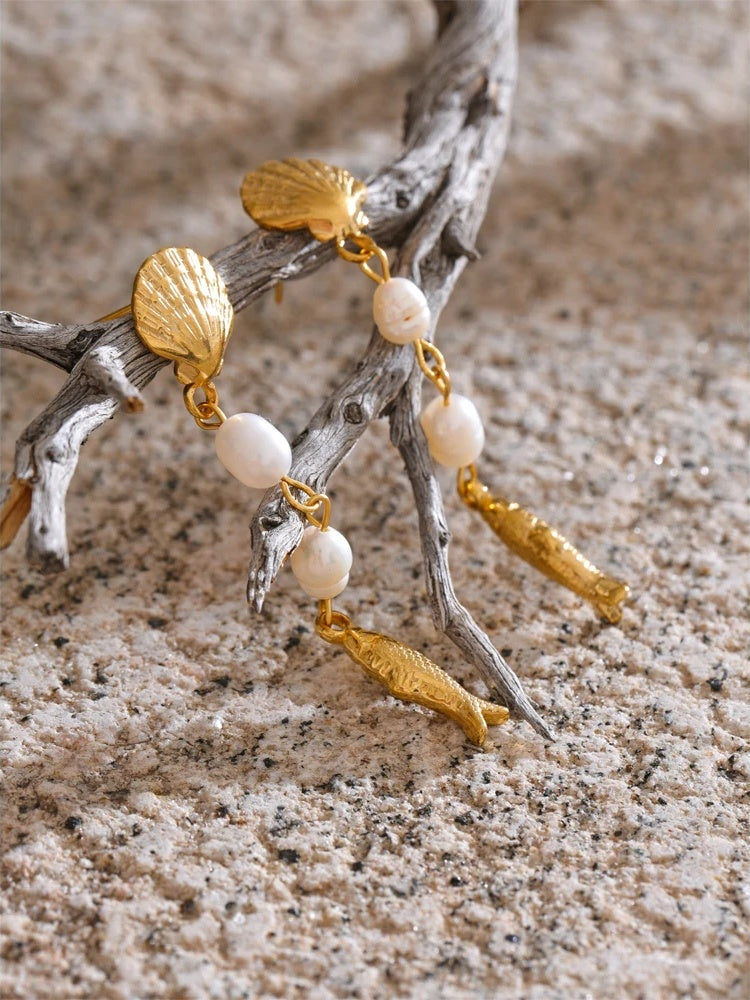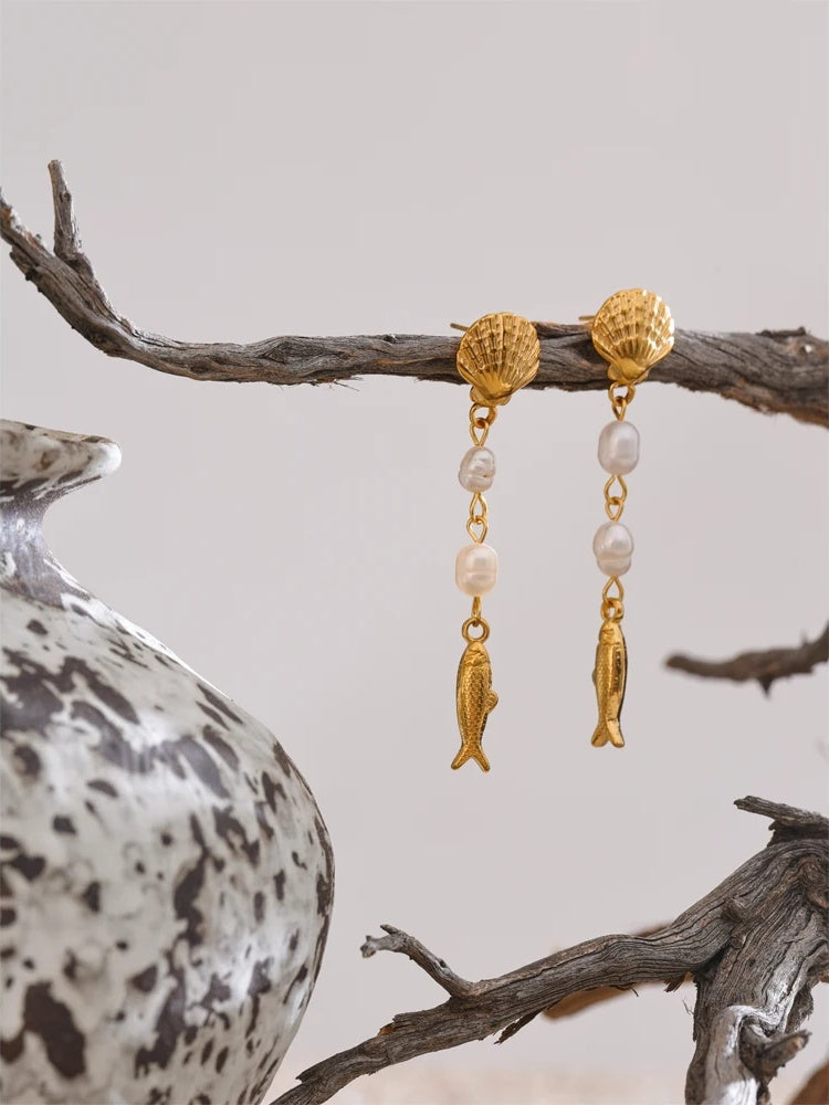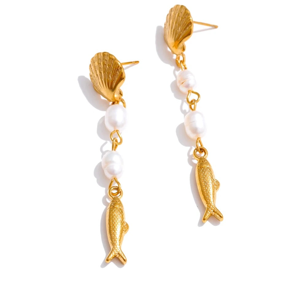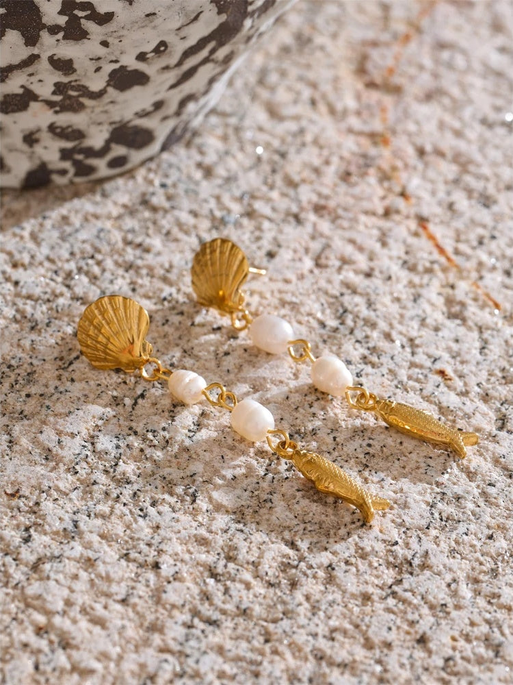 Effortlessly channel coastal elegance with these long dangle earrings. Luminous freshwater pearls meet intricately textured geometric shell and fish motifs for a modern, seaside statement. Crafted in gold-plated stainless steel, these gold-plated earrings offer a radiant finish with dependable durability—lightweight and comfortable from day to evening. A refined choice for lovers of dainty gemstone jewelry and coastal-inspired accessories.