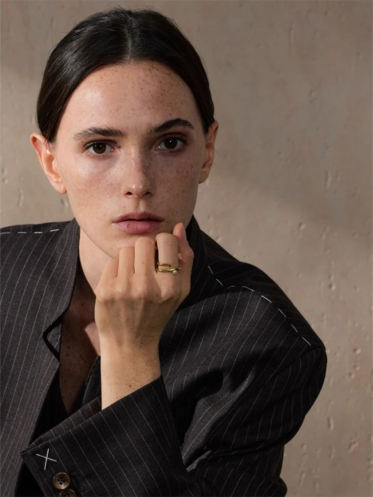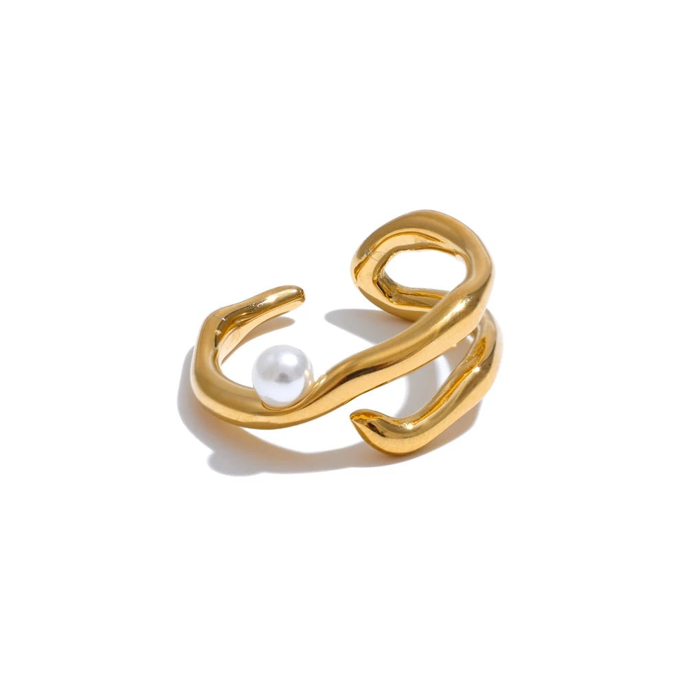 A contemporary open ring crafted from high-quality stainless steel with a polished gold finish offers a bold yet elegant statement. Featuring a geometric design, the piece is accented by a single simulated pearl that adds a touch of sophistication. Lightweight and comfortable, this ring is suitable for various occasions, from parties to everyday wear. Its unique form and durable construction make it a versatile addition to any jewelry collection.