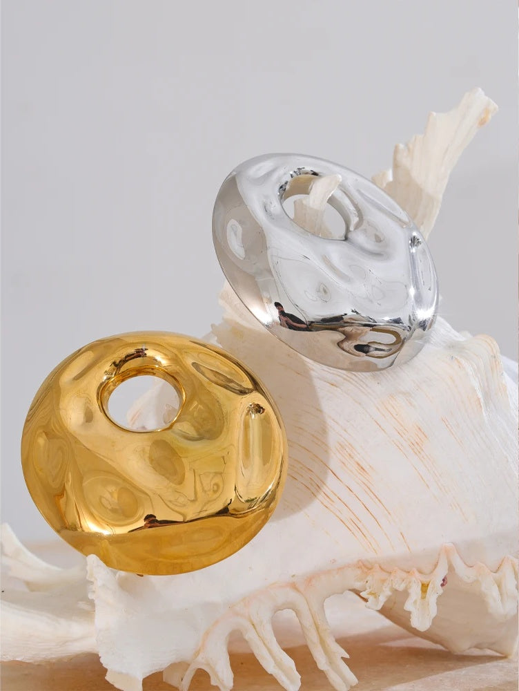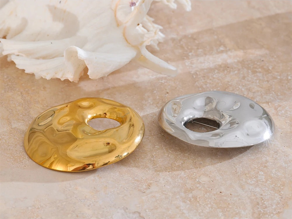 Crafted from durable stainless steel with a polished finish, this large round brooch features a distinctive hammered design that catches the light for a dynamic effect. Measuring 65mm in diameter, it offers a bold, geometric statement piece suitable for both men and women. The brooch is treated with a waterproof coating, ensuring lasting shine and wear resistance. Available in steel or gold-tone options, it combines contemporary style with practical durability.